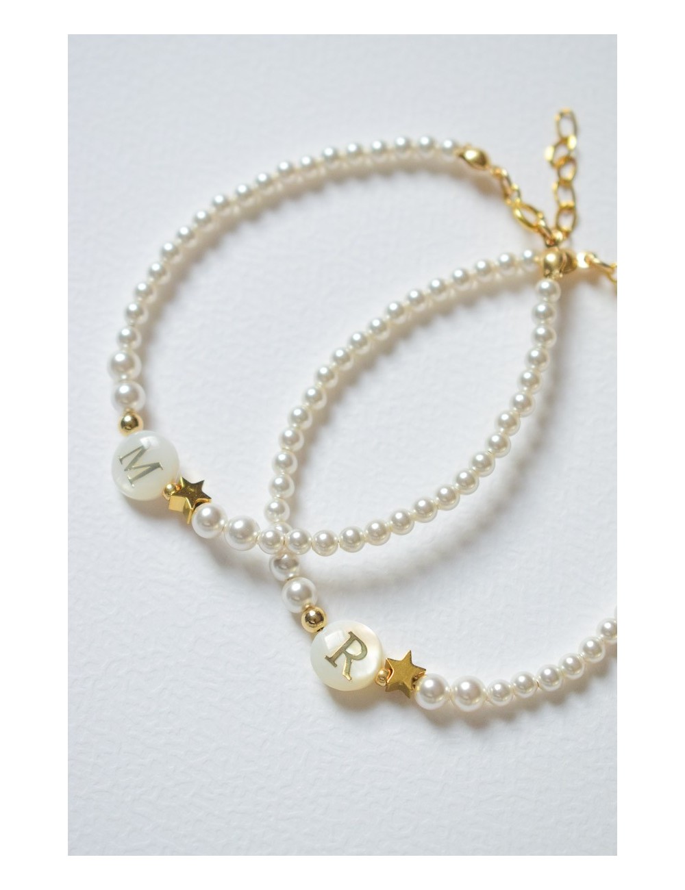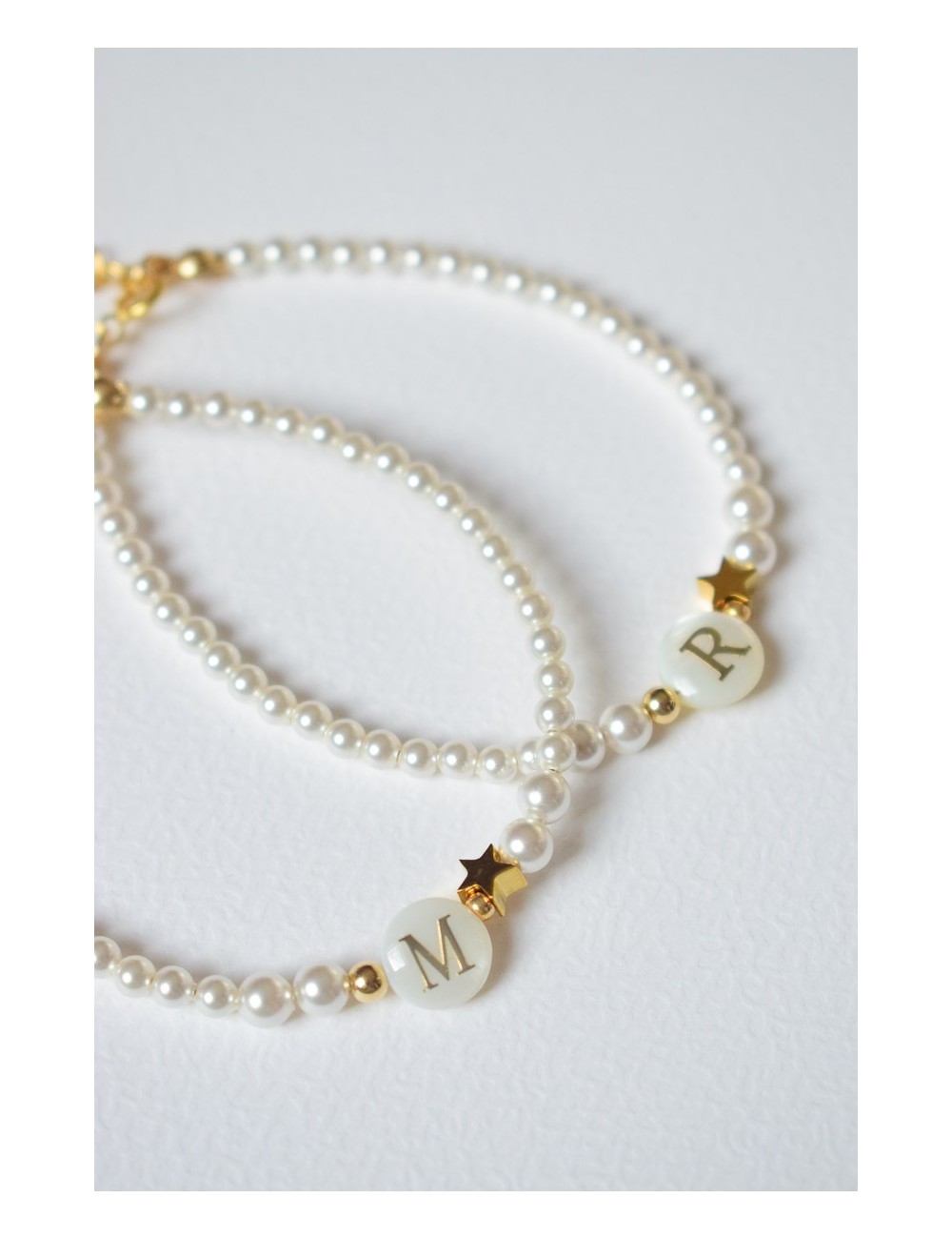 DESCRIPTION : adorable bracelet à offrir à vos témoins, demoiselles d'honneur, maman, soeur... ou à toute personne chère à votre coeur. Le bracelet comporte un palet de nacre avec une initiale en son centre. Cette initiale peut être la vôtre, ou celle de la personne à qui vous offrez ce bijou. Le bracelet existe uniquement en blanc et en doré.