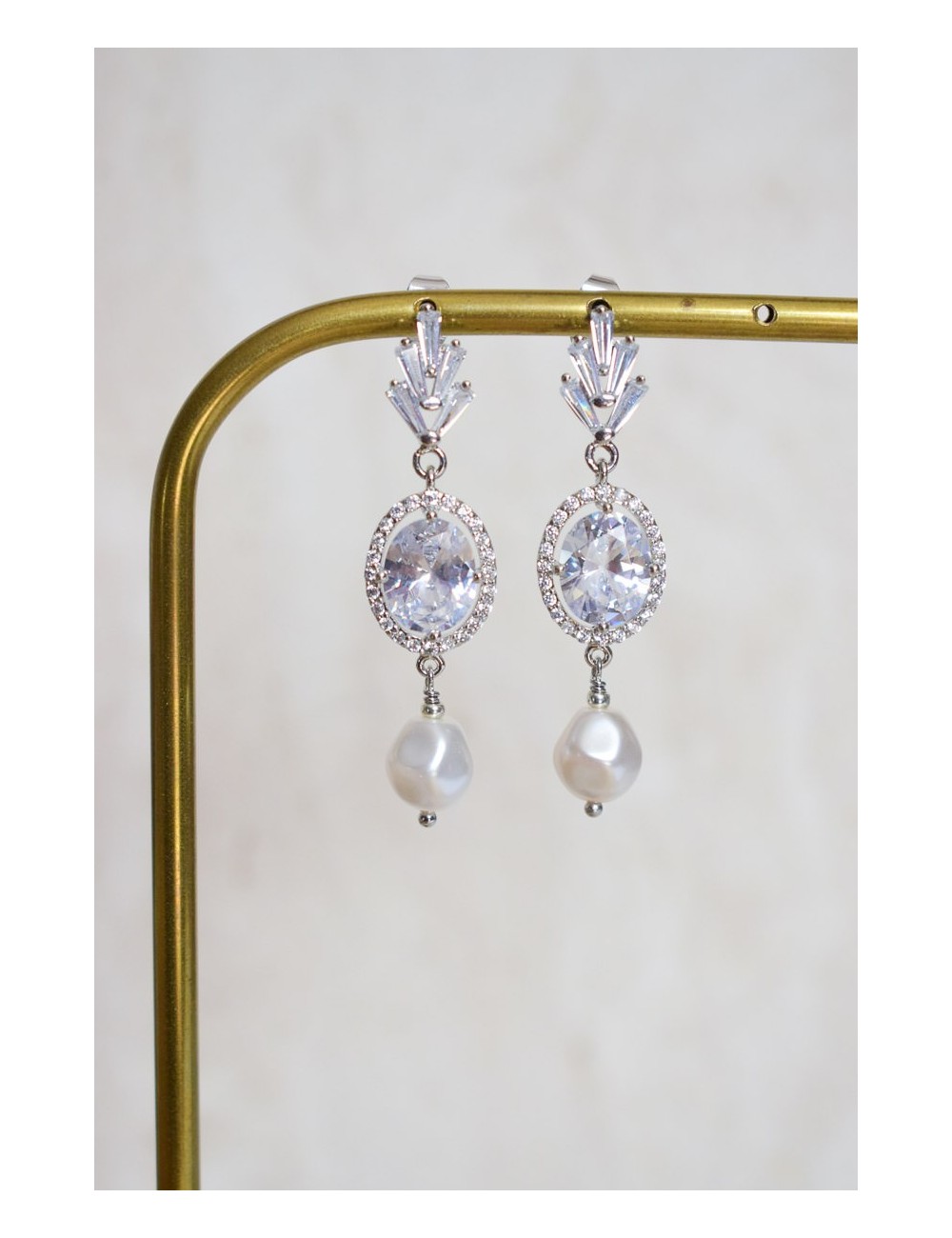 DESCRIPTION : Une jolie paire de boucles d'oreilles au style glamour et vintage, travaillée sur de magnifiques puces d'oreilles art déco, suivies d'une forme ovale pavée de strass, et d'une perle nacrée irrégulière à retomber. Elles sont éclatantes et apportent de la lumière au visage.