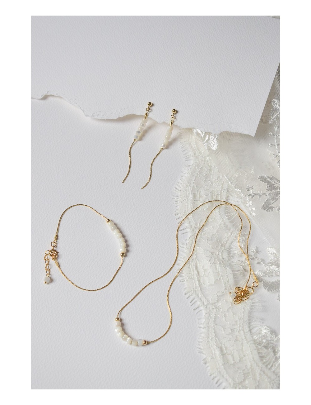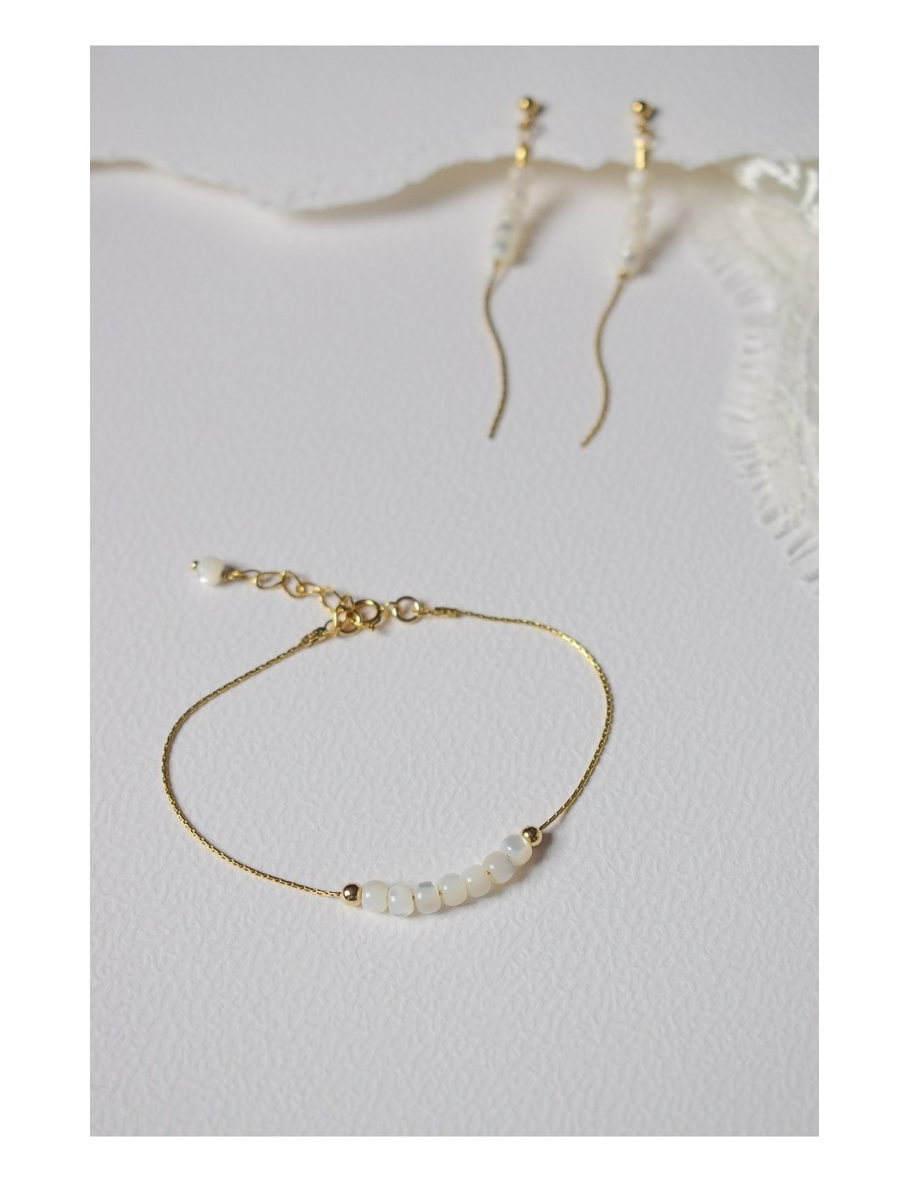 Perles en nacre véritable, puces en gold filled ou argent, chaine en acier inoxydable.