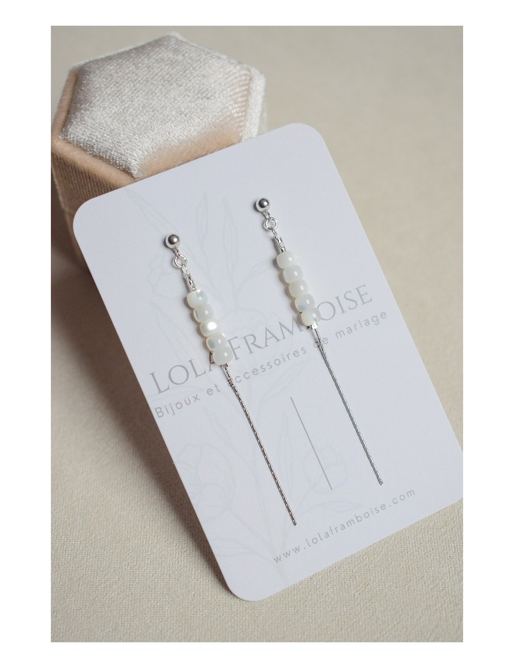 Boucles d'oreilles de mariage Virtuose sont très fines et surtout légères. 5 perles de nacre sont montées sur une chaine maille serpent et terminées par un fermoir clou discret. Les boucles d'oreilles Virtuose sauront apporter de l'éclat à votre visage et accompagner votre robe à merveille.