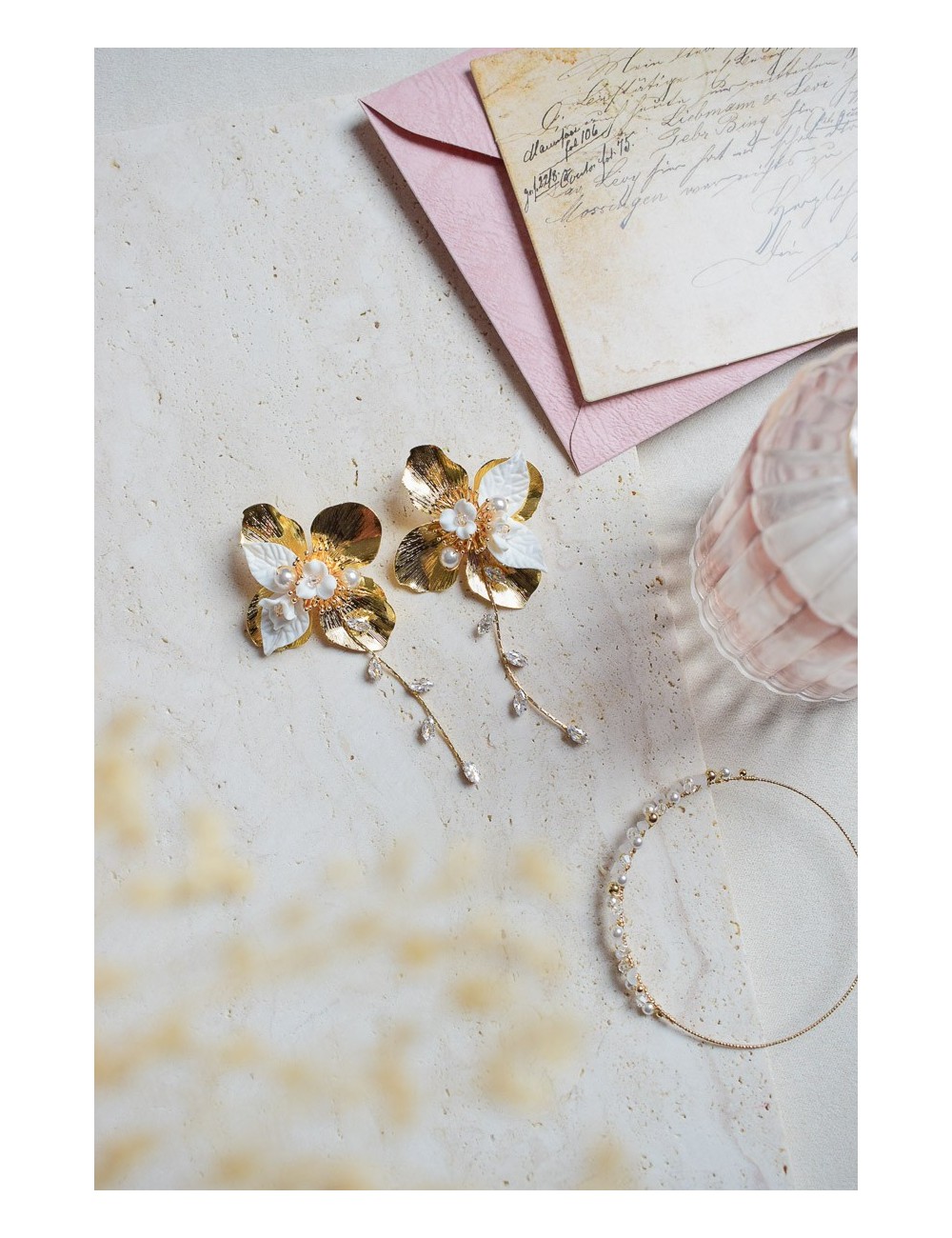 Boucles d'oreilles pour mariée en forme de grandes fleurs en laiton.