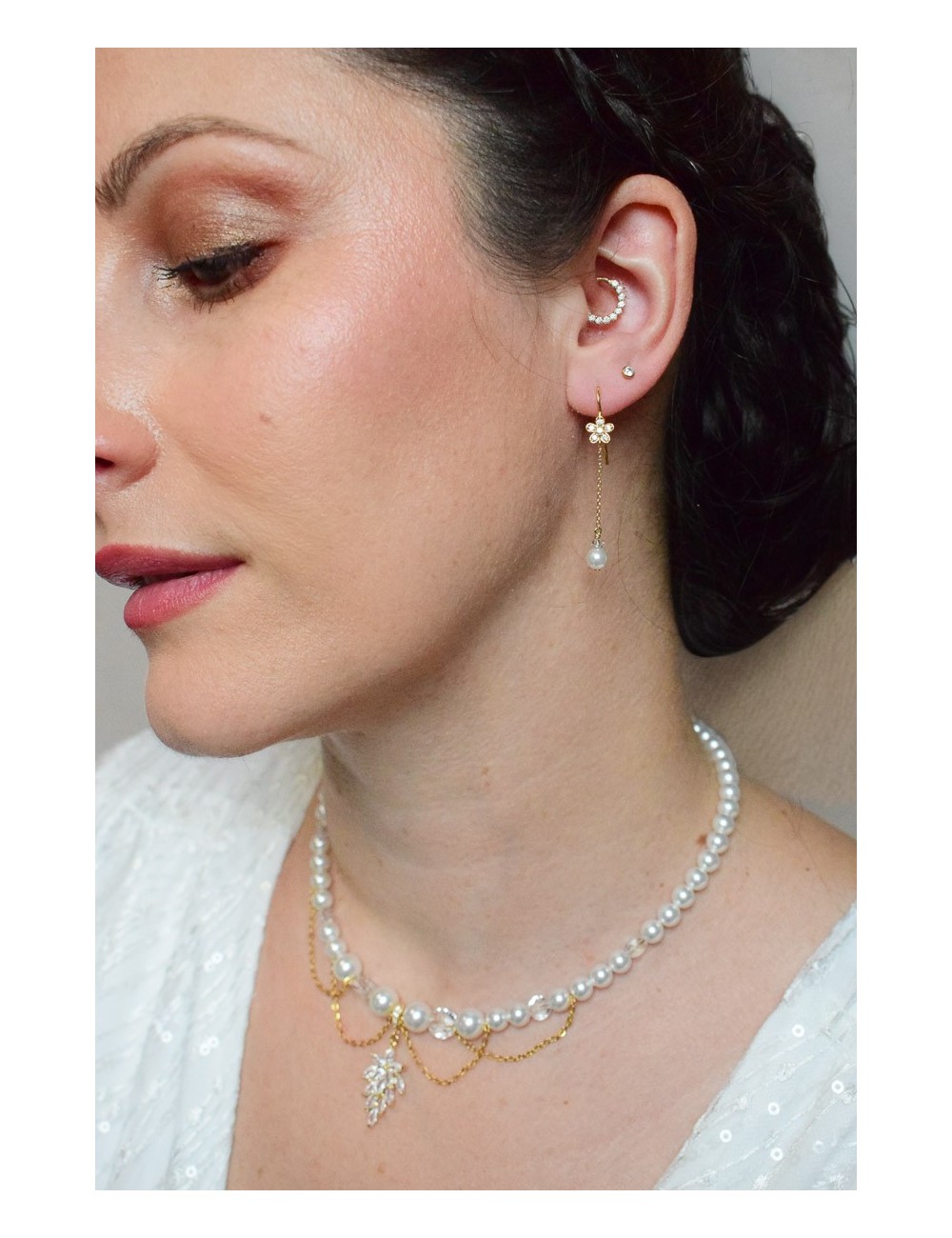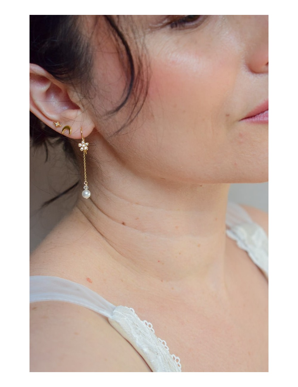 DESCRIPTION : boucles d'oreilles aux crochets fleuris, avec une jolie chute de perles nacrées sur une chaine très fine. Ces boucles sont agréables à porter, légères et restent peu pendantes. Elles sont parfaites associées à un collier composé de perles nacrées, qui soit d'un style sobre comme plus travaillé.