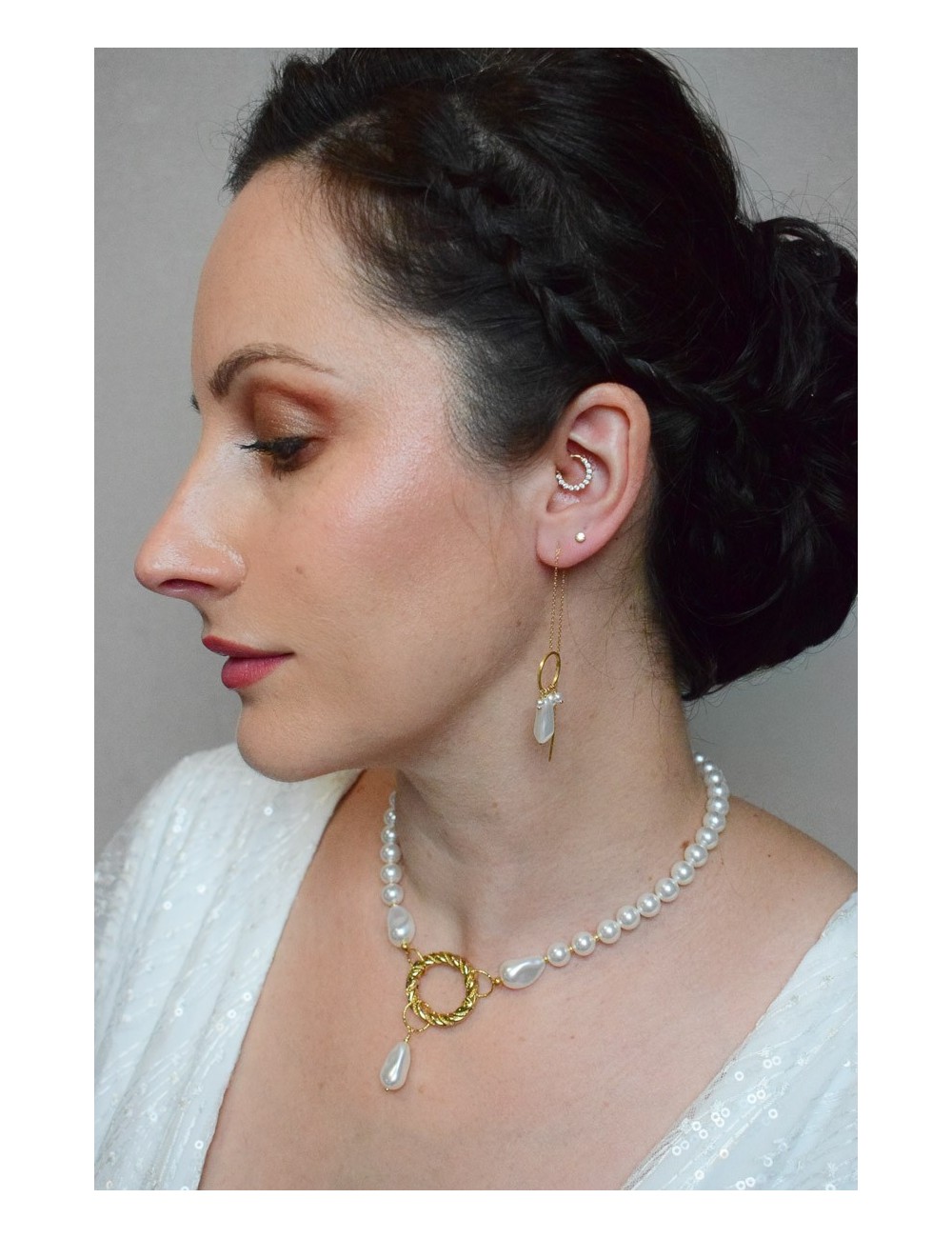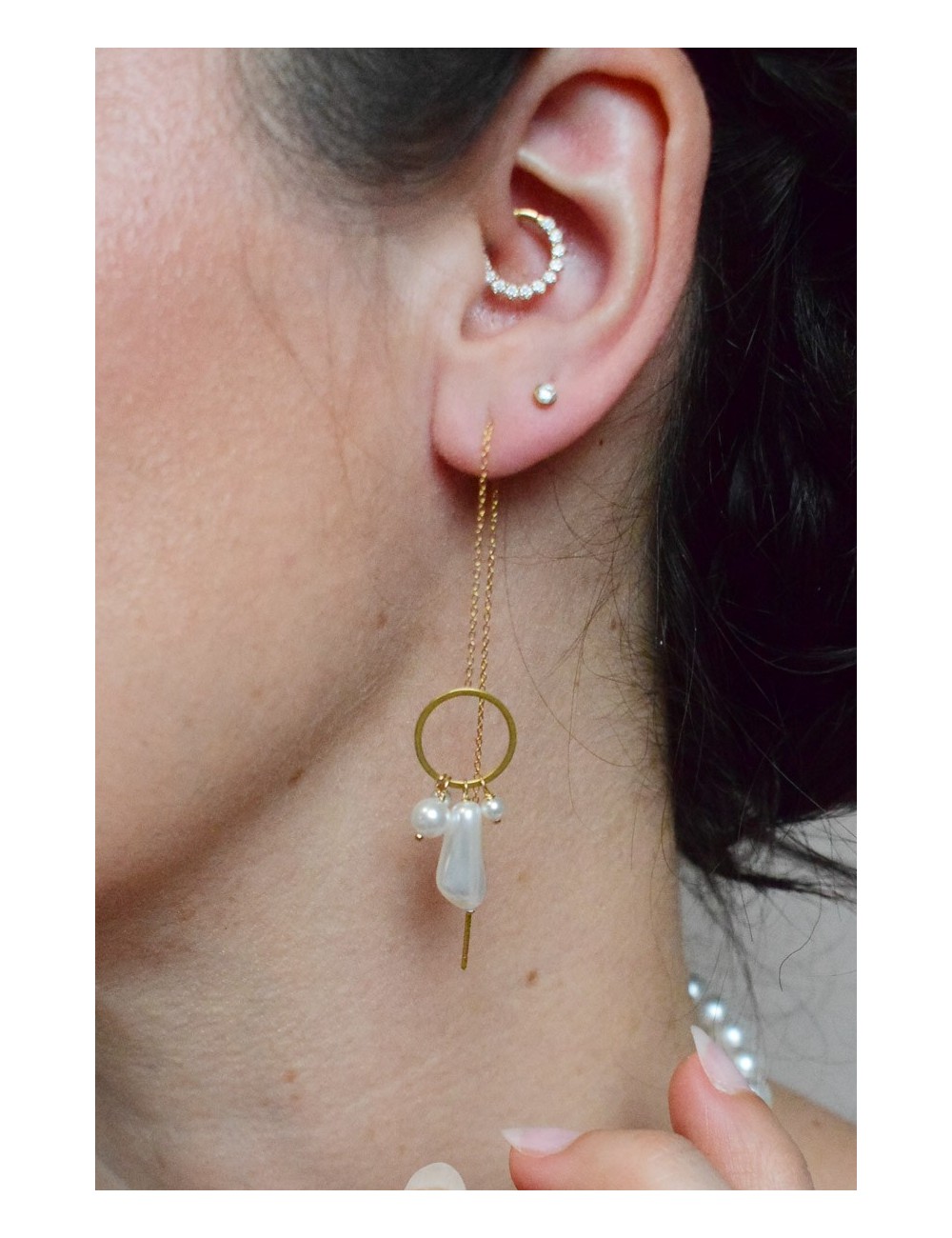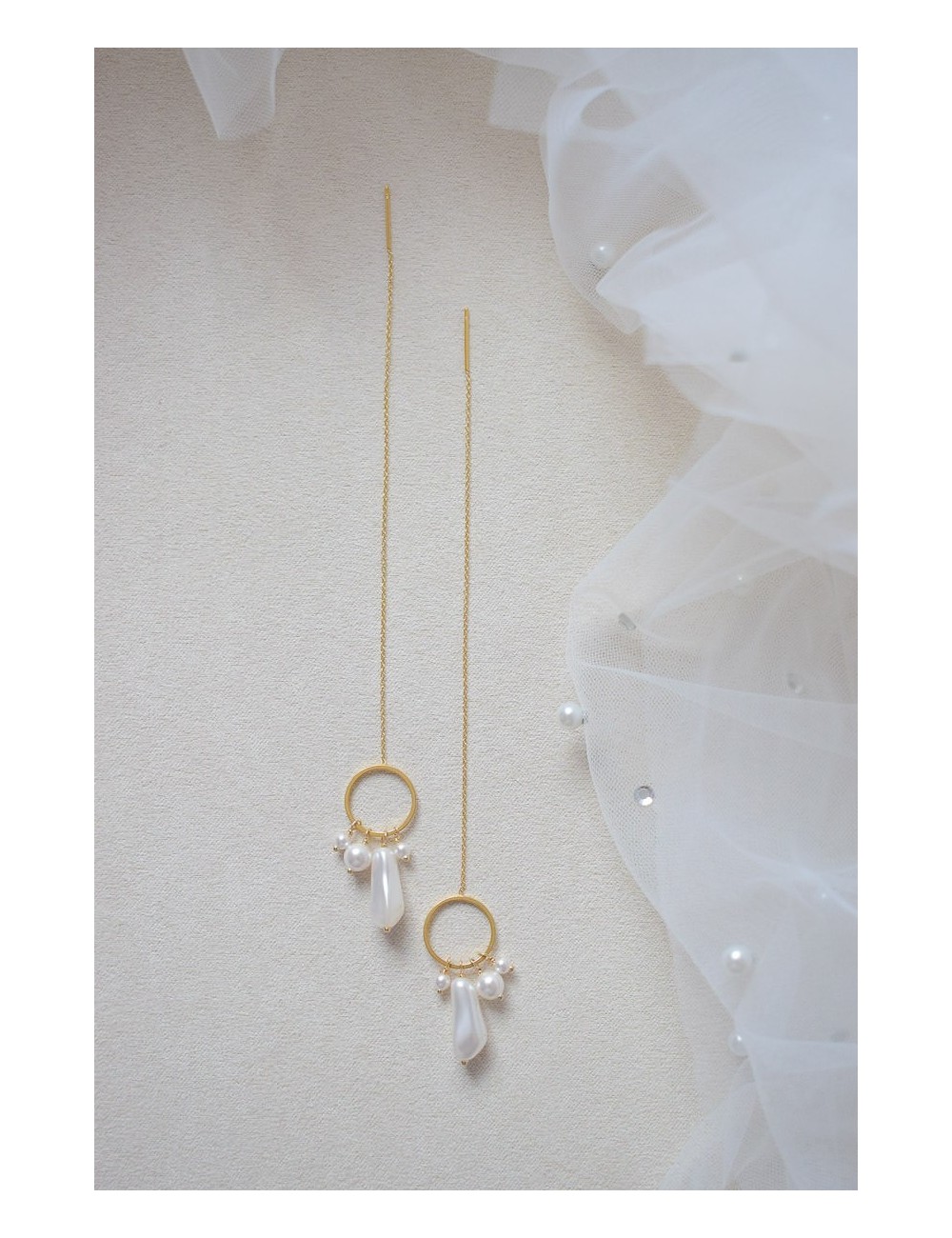 DESCRIPTION : les boucles d'oreilles pendantes Rochelle sont idéales pour une mariée audacieuse qui souhaite se démarquer. Elles s'associent parfaitement aux robes modernes, de part leur style avec des cercles dorés et des perles nacrées irrégulières. Elles s'enfilent dans le trou du lobe de l'oreille et se font coulisser jusqu'à la longueur désirée. La chaine est très fine.