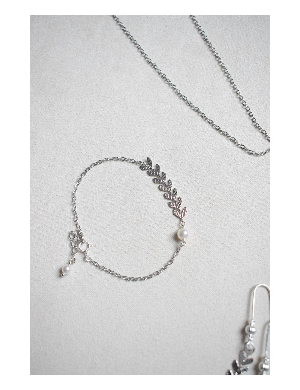 DESCRIPTION : Le bracelet pour la mariée Oly est monté sur une fine chaine et comporte un motif central de forme épi de blé (ou chevrons) doré ou argenté. Ce bijou raffiné est orné d'une perle nacrée, symbole de pureté et d'élégance intemporelle. Très fin et délicat, idéal pour finir la tenue de la mariée bohème chic sans charger.