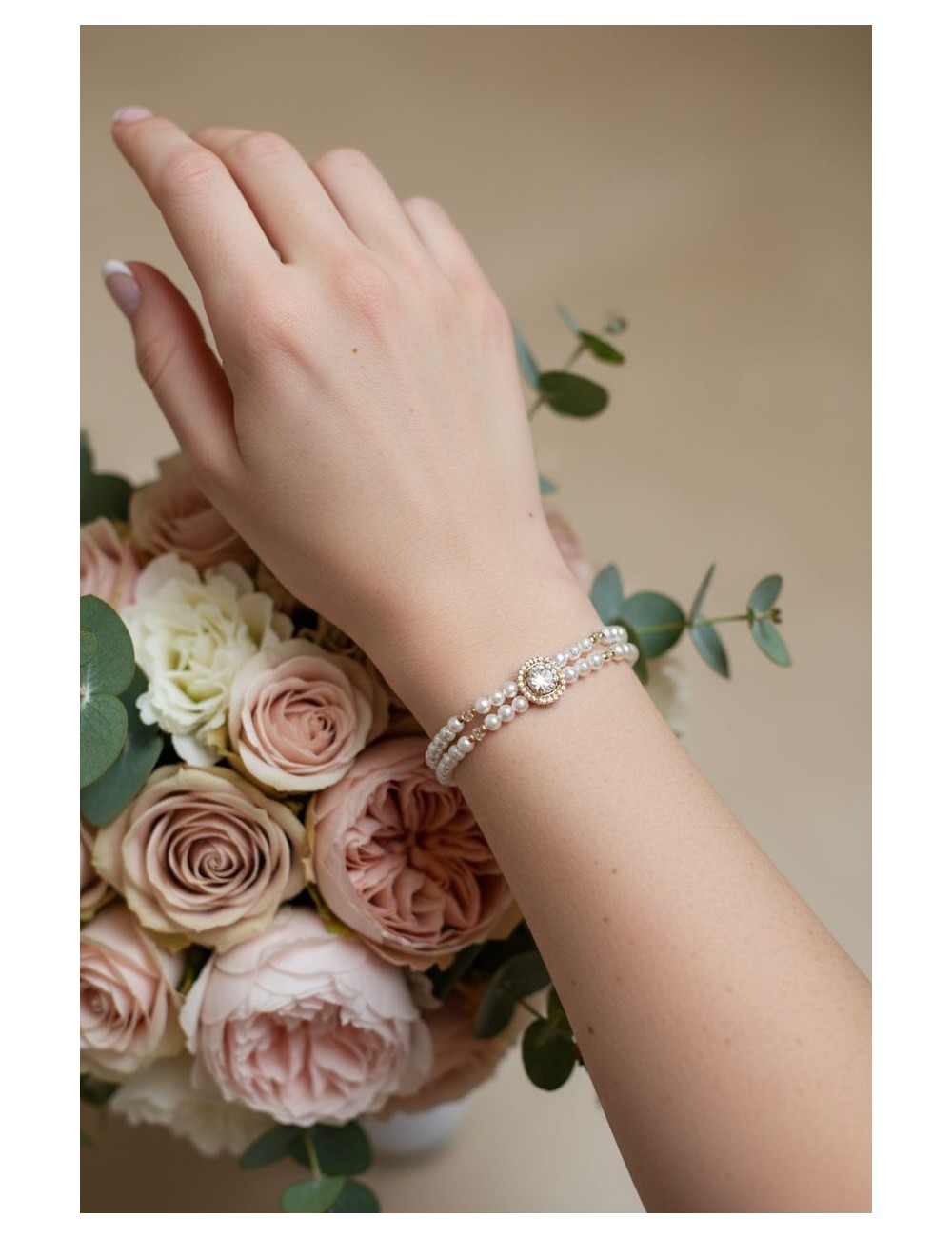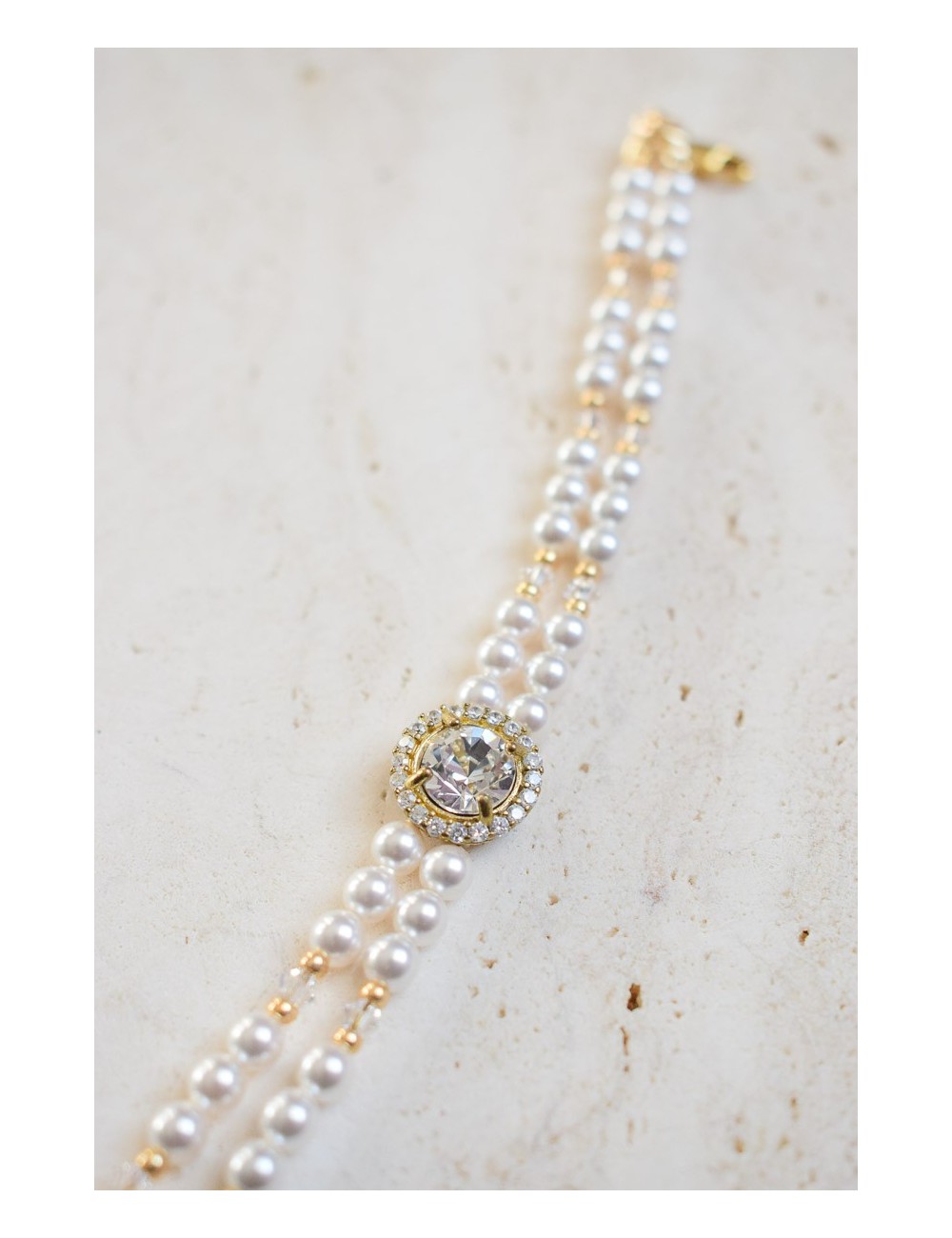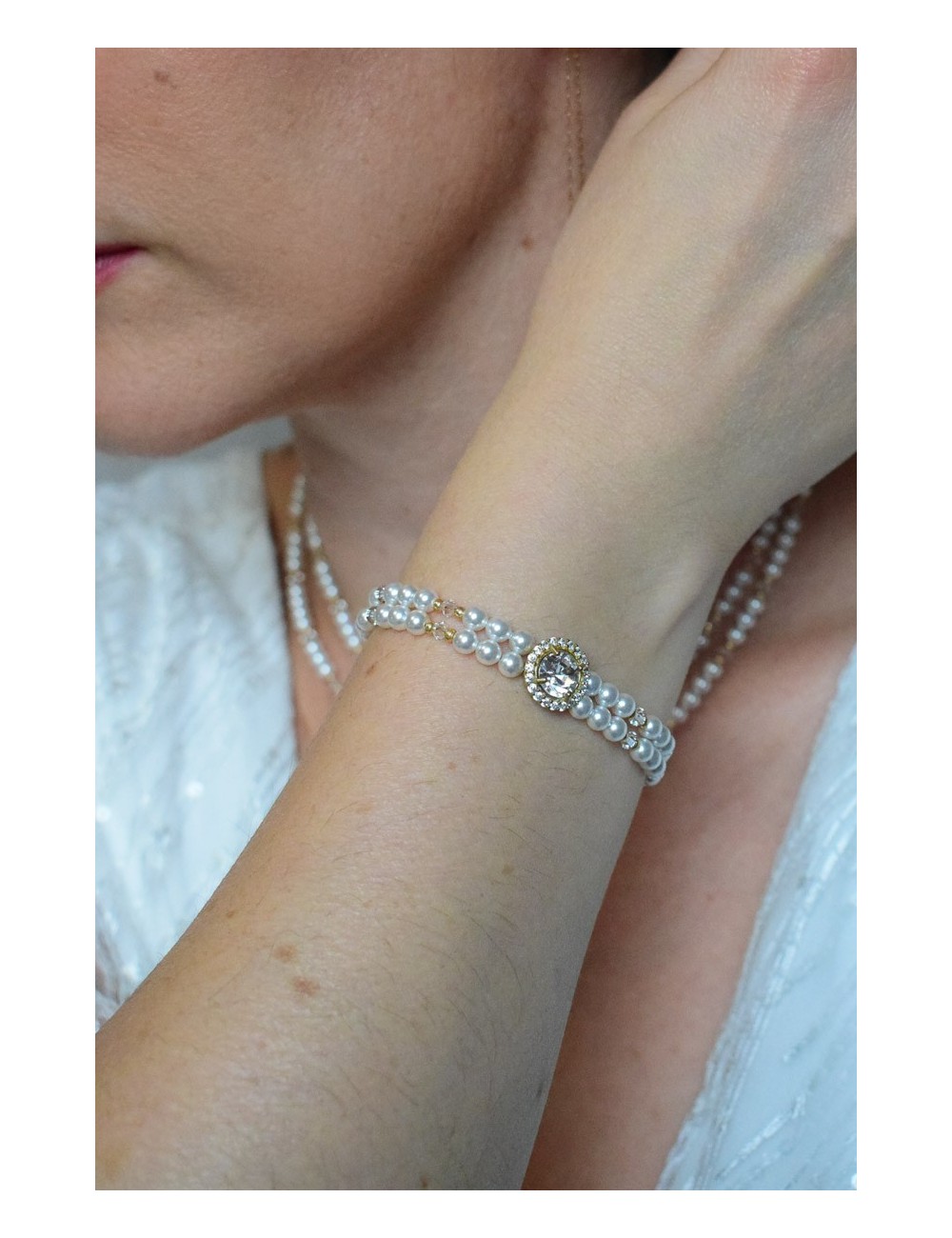 DESCRIPTION : D'un style glamour chic, le bracelet de mariée Juliette et composé d'un somptueux cabochon central serti de strass, accompagné de 2 rangs de perles nacrées mêlées d'une touche de cristal et de perles dorées.