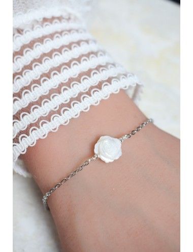 DESCRIPTION : le bracelet de mariage Lolita est un modèle romantique et raffiné, dont le motif central est une fleur de nacre entourée de perles métalliques. Il est monté sur une fine chaine et est très léger.