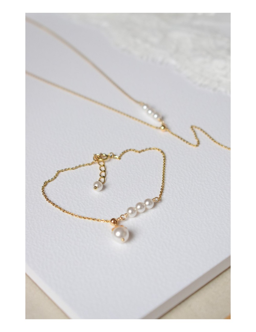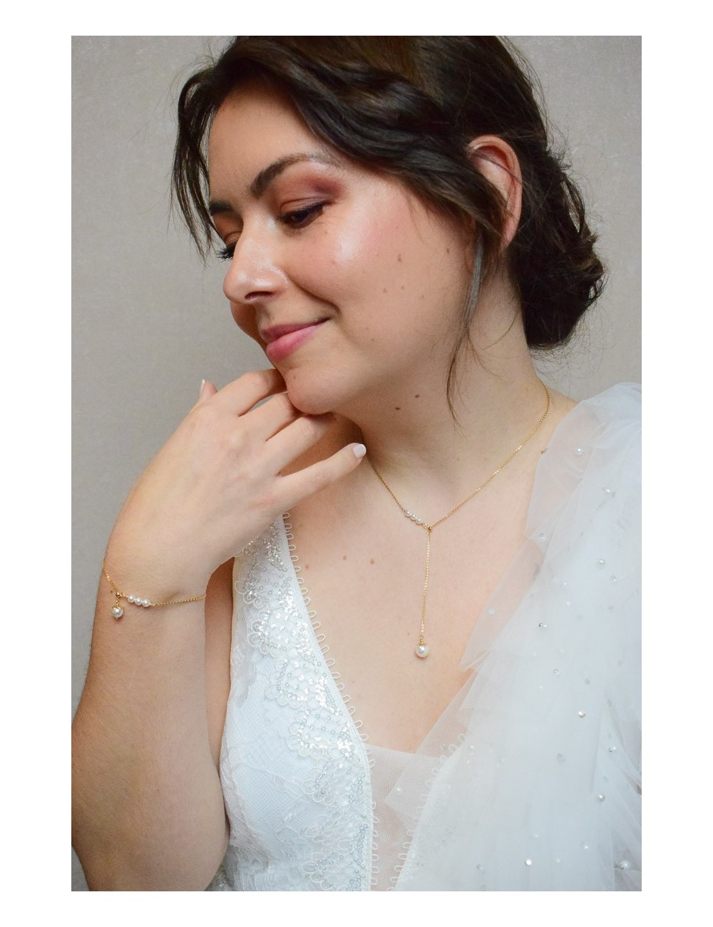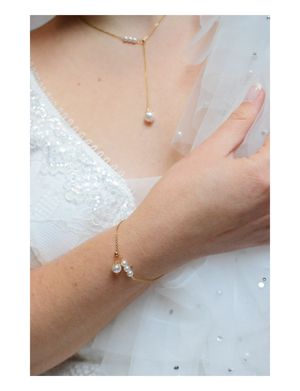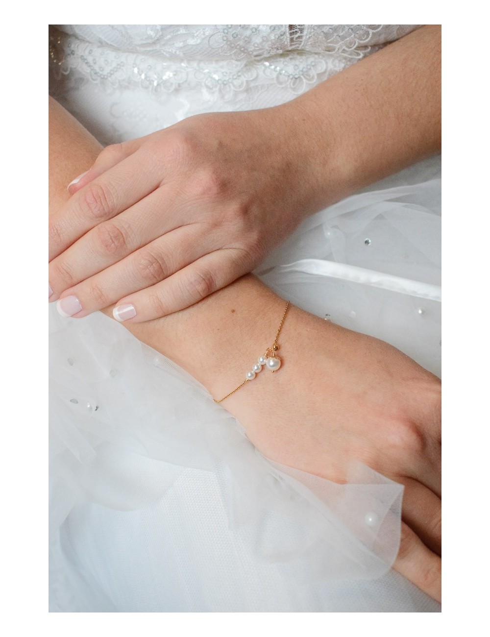 DESCRIPTION : un bracelet au style minimaliste, discret et très léger. 3 petites perles nacrées à porter au centre du poignet, accompagnées d'une perle un peu plus grosse sous forme de breloque. La perle dorée est une perle qui permet de faire coulisser la chaine, et de jouer sur la taille de la breloque au besoin (elle peut être courte comme sur les photos, ou plus longue).
