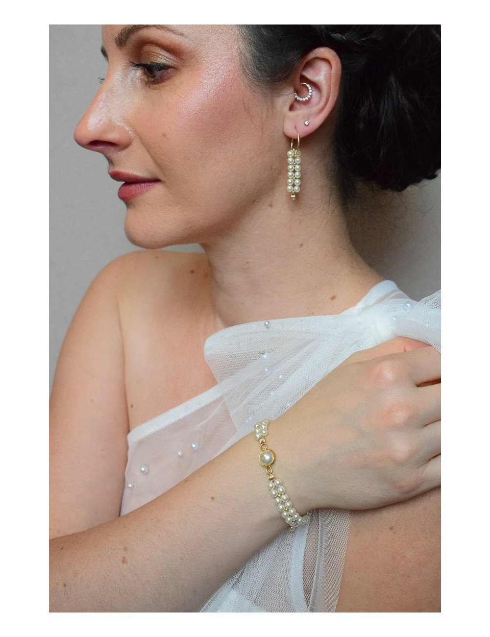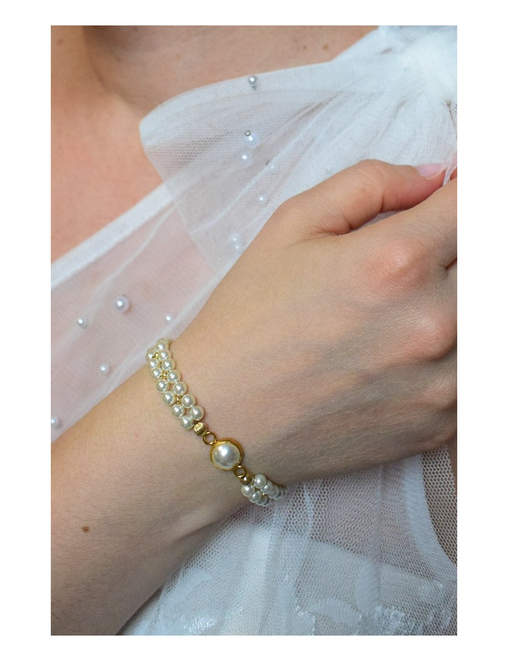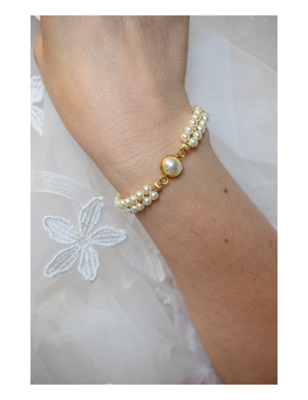 DESCRIPTION : Le bracelet pour la mariée Solaire est un modèle tissé sur une largeur de 2 rangs de perles nacrées, intercalées de petites perles dorées. C'est un modèle élégant et intemporel.
