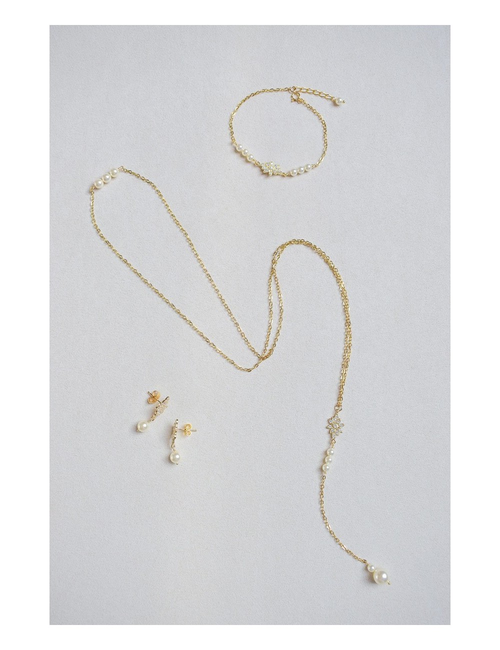 COMPOSITION : perles nacrées en cristal, laiton doré ou rhodié pavé d'oxydes de zirconium, chaîne en acier inoxydable doré ou argenté.