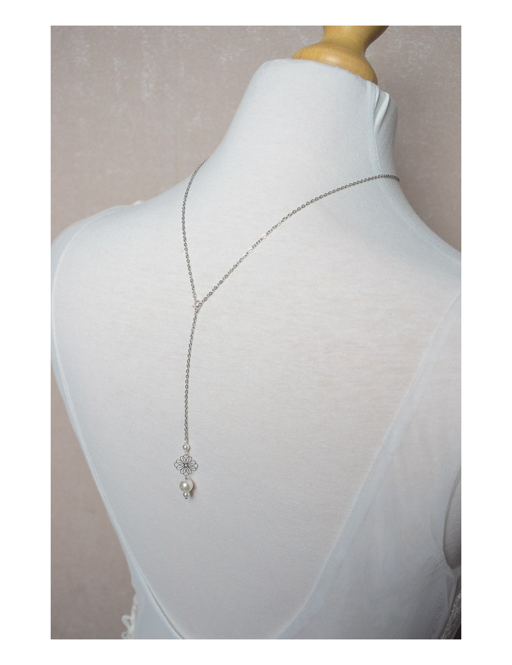 Le collier de dos mariage Daisy est très très fin. Il est composé d'une délicate fleur sur le devant, encadrée de perles nacrées. On retrouve la même fleur dans le dos, sur le pendentif qui habillera votre dos nu.