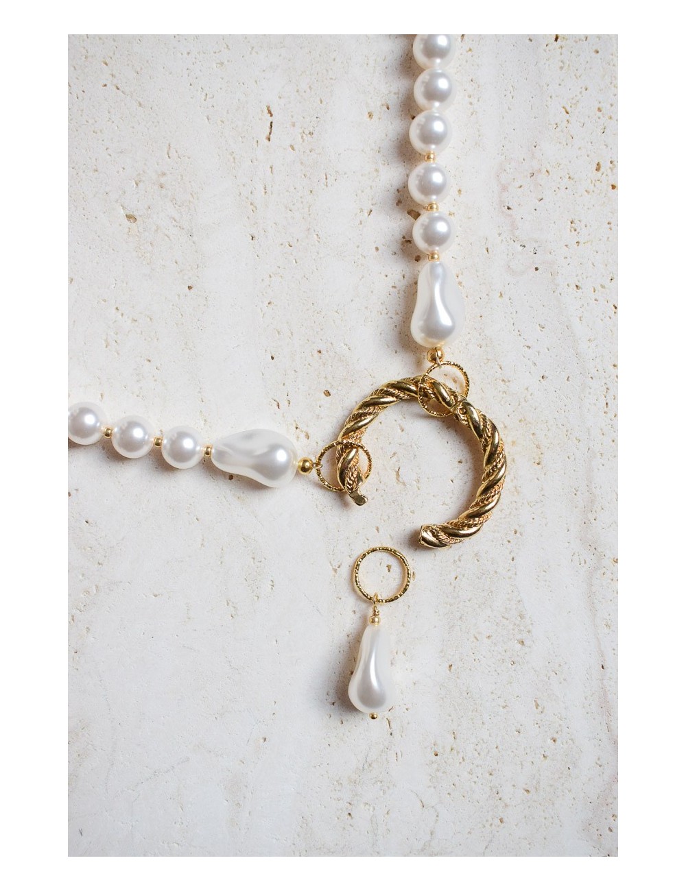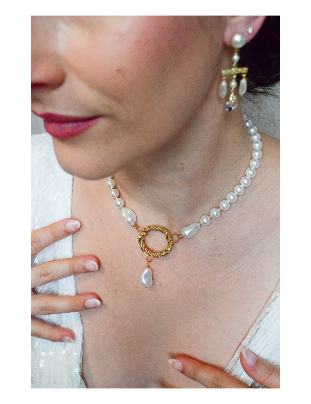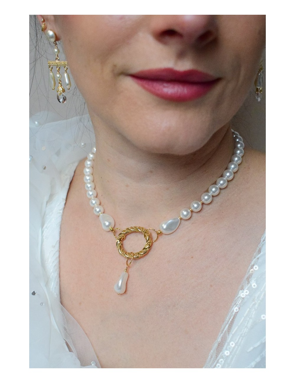 DESCRIPTION : Le collier de mariage Horizon est un modèle original et audacieux. Sa pièce maitresse est son fermoir de forme ovale, qui se clipse sur le devant. Vous pouvez choisir de passer le pendentif avec la perle irrégulière dans le fermoir, ou non, lorsque vous porterez le collier. Le fermoir est doré et torsadé. Les perles sur le bijou sont de forme irrégulière et ronde, et de belle taille (8mm) ce qui en fait un bijou qui ne passera pas inaperçu.