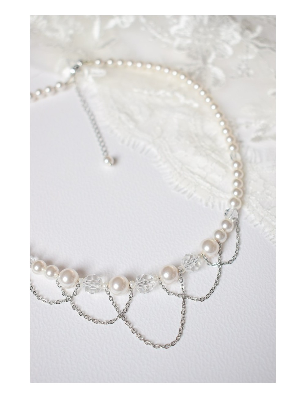 DESCRIPTION : un collier au style romantique et chic, agrémenté d'une multitude de perles nacrées et transparentes montées les unes après les autres sur un fil souple. Quelques petites vagues de chaîne aux fins maillons viennent souligner le rang de perles et apporter de l'éclat ainsi que de la matière au bijou. C'est un modèle qui est à la fois habillé et délicat, très agréable à porter.
