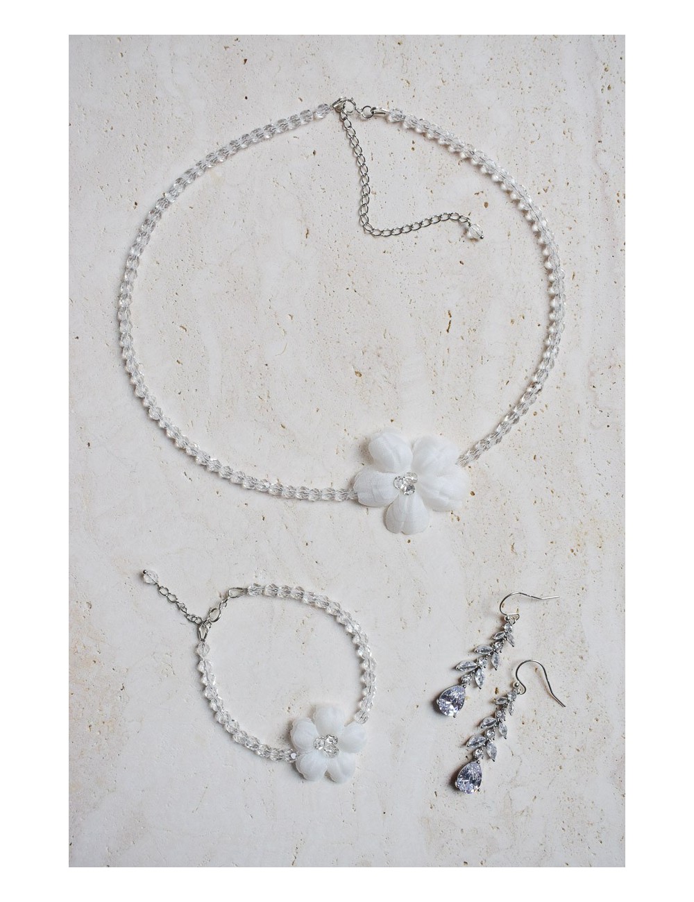 Collier mariage Ecume avec une fleur en soie et perles transparentes