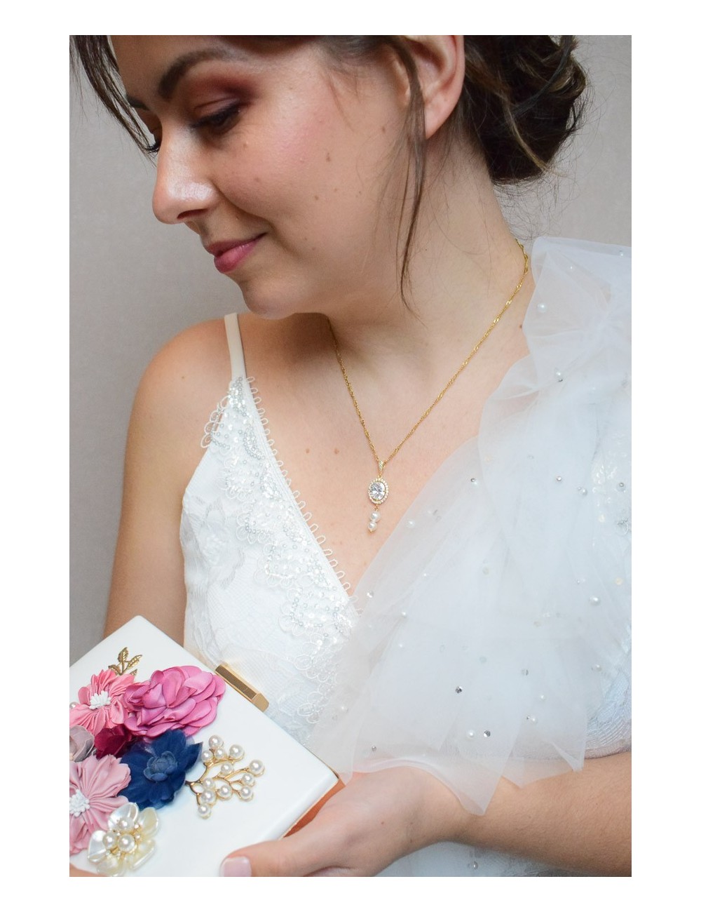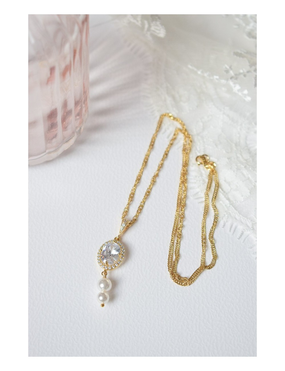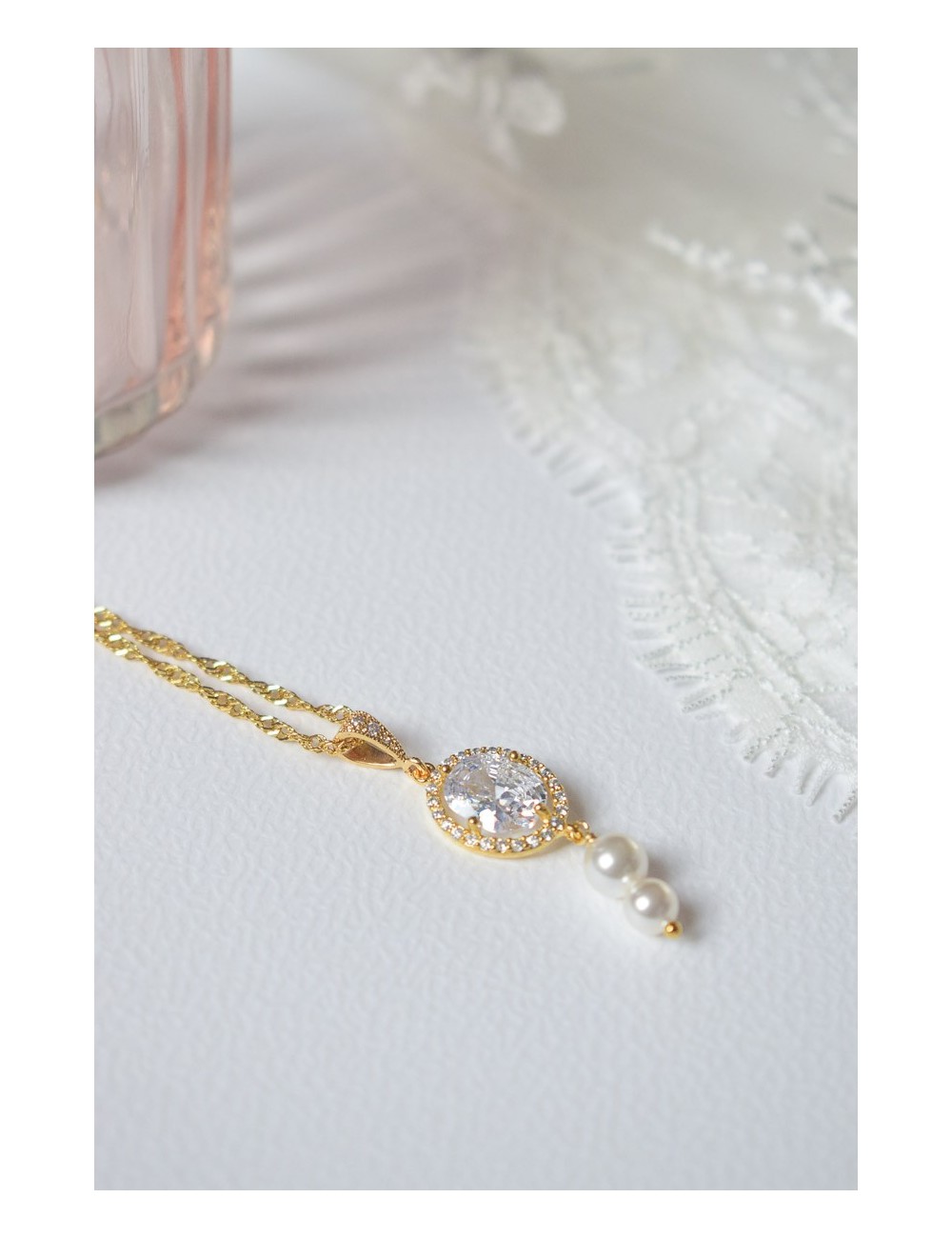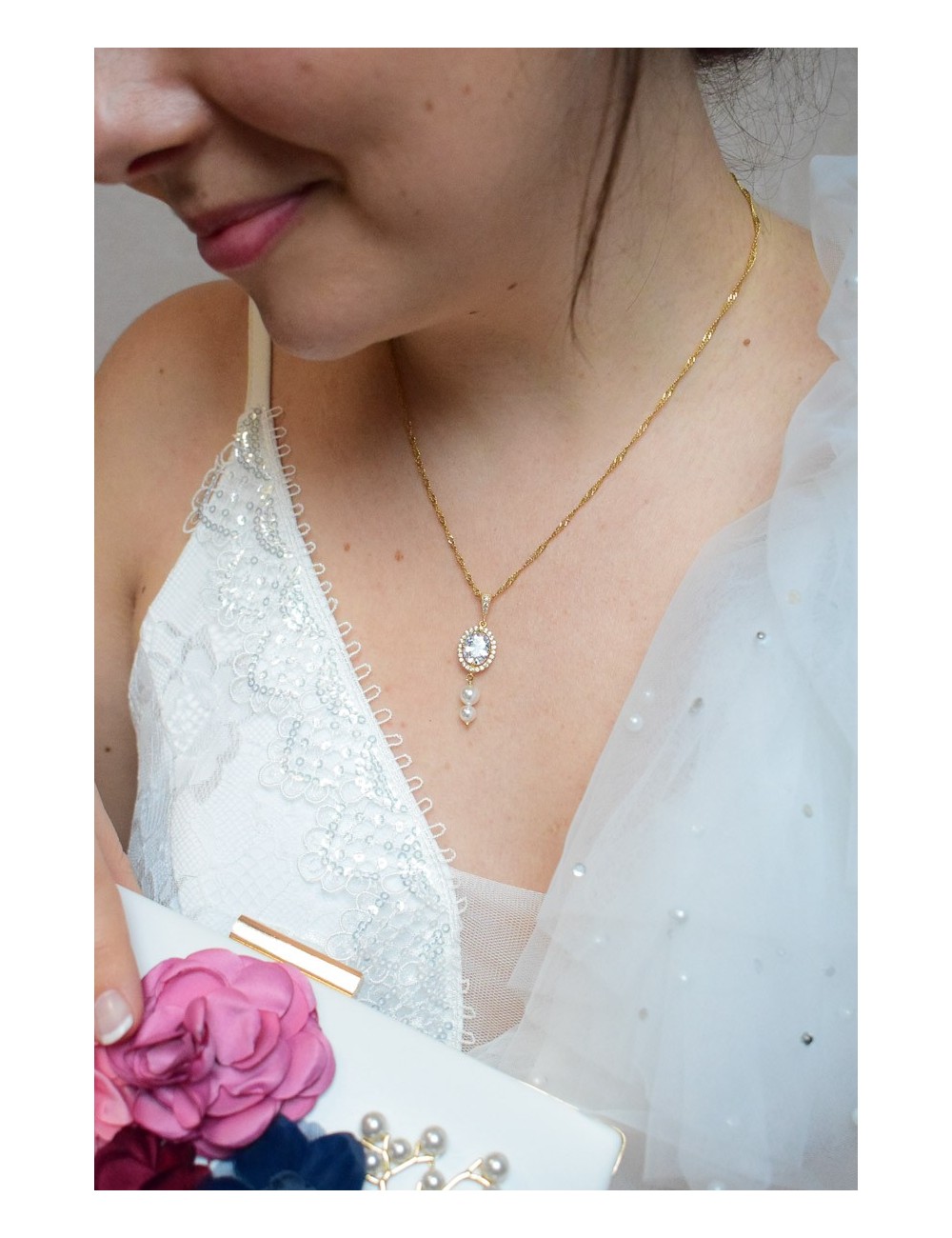 DESCRIPTION : Le collier de mariage Pixie est un bijou de mariage simple, composé d'une belle chaine maille Singapour (torsadée), d'une bélière pavée de strass et d'un pendentif ovale strassé accompagné de perles nacrées. Il retombe joliment dans le décolleté pour habiller le buste sans charger, en apportant une touche d'éclat.