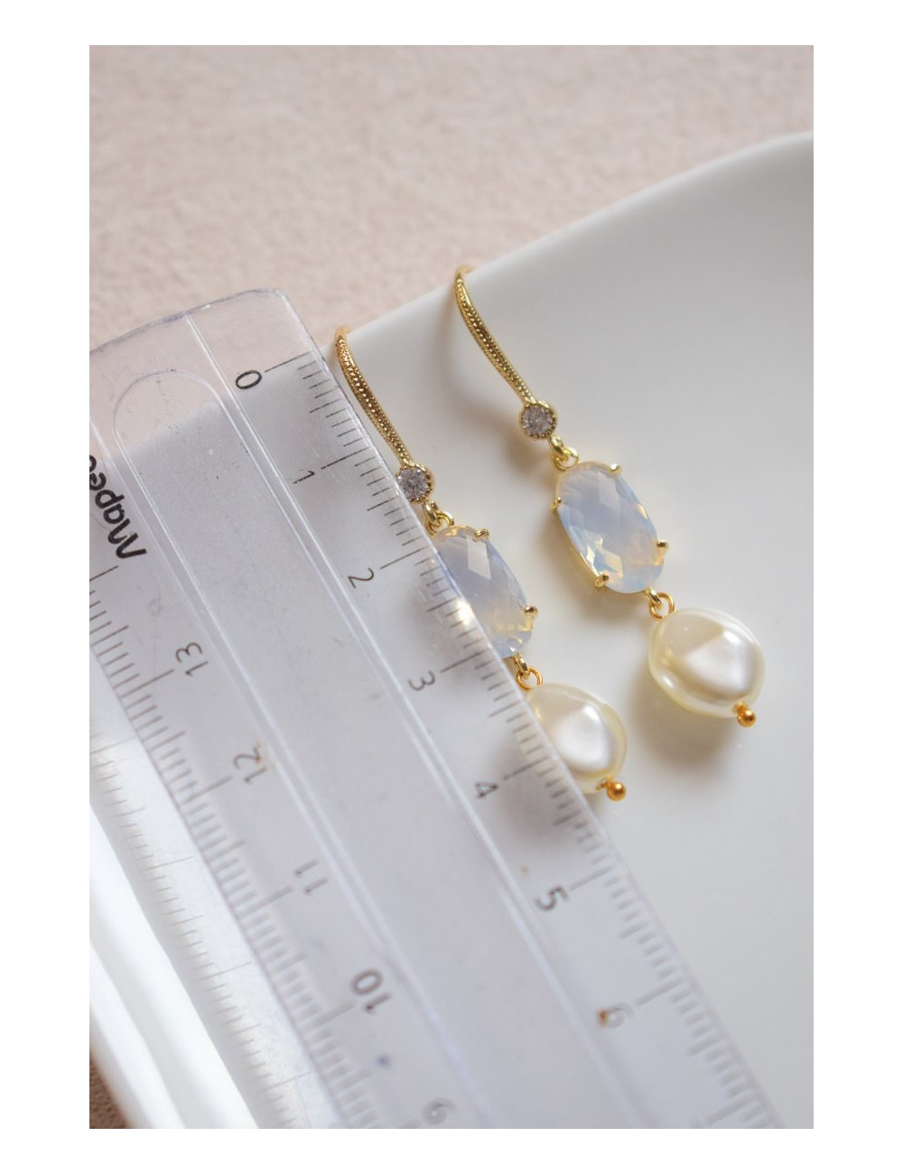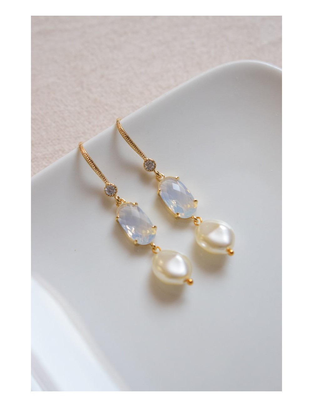 Crochets en laiton plaqué or avec oxyde de zirconium. Perles de cristal nacrées. Cabochon en verre blanc laiteux.