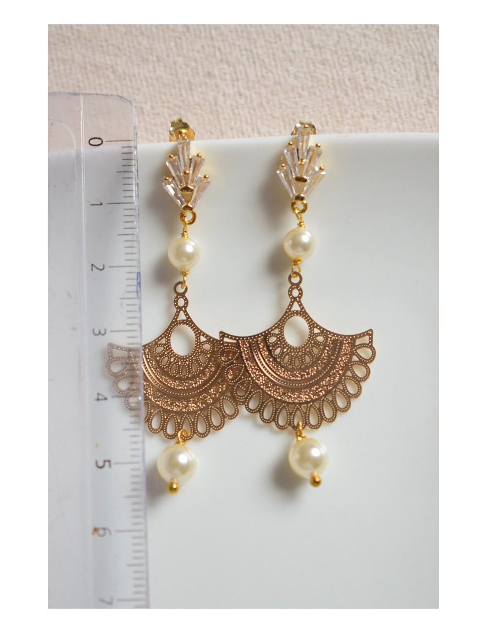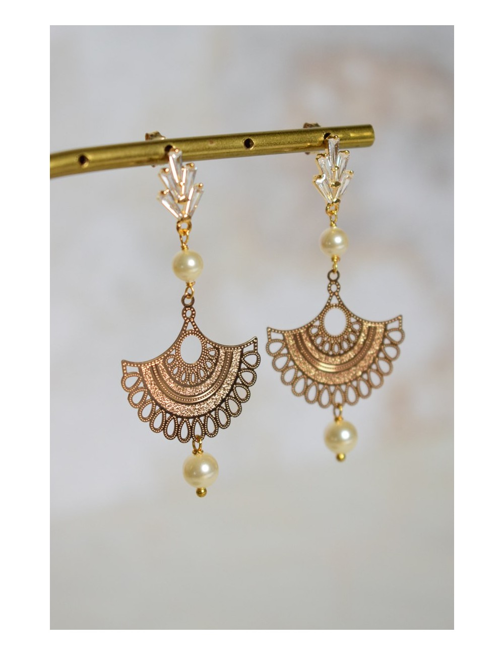 Puces en laiton plaqué or pavées d'oxydes de zirconium. Perles de cristal nacré, estampe en laiton doré.