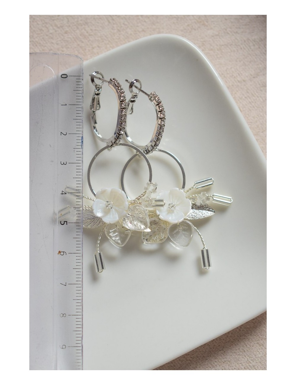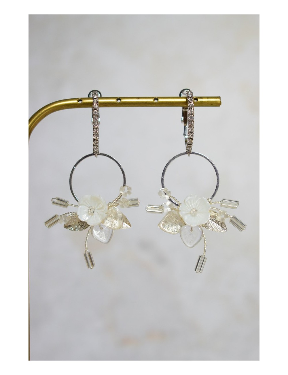 Dormeuses en laiton argenté avec oxydes de zirconium. Nacre véritable, perles de verre, laiton argenté.