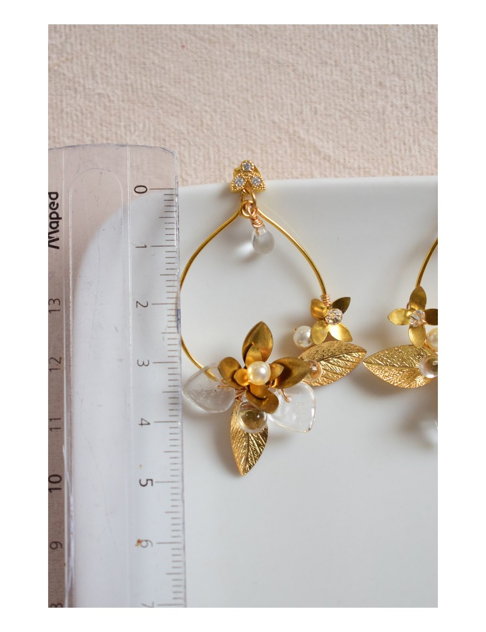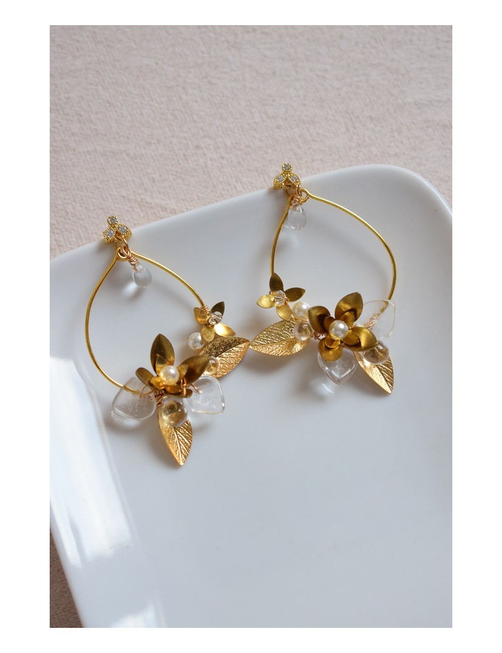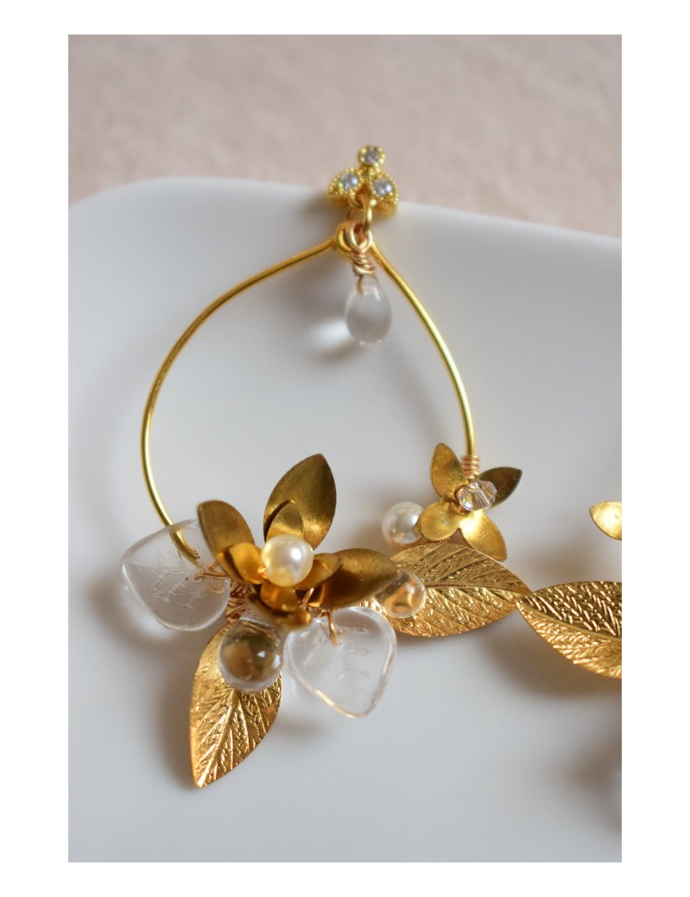 Puces en laiton plaqué or avec oxydes de zirconium. Perles gouttes en verre, perles en cristal nacré ivoire, feuilles en laiton doré. Laiton doré.
