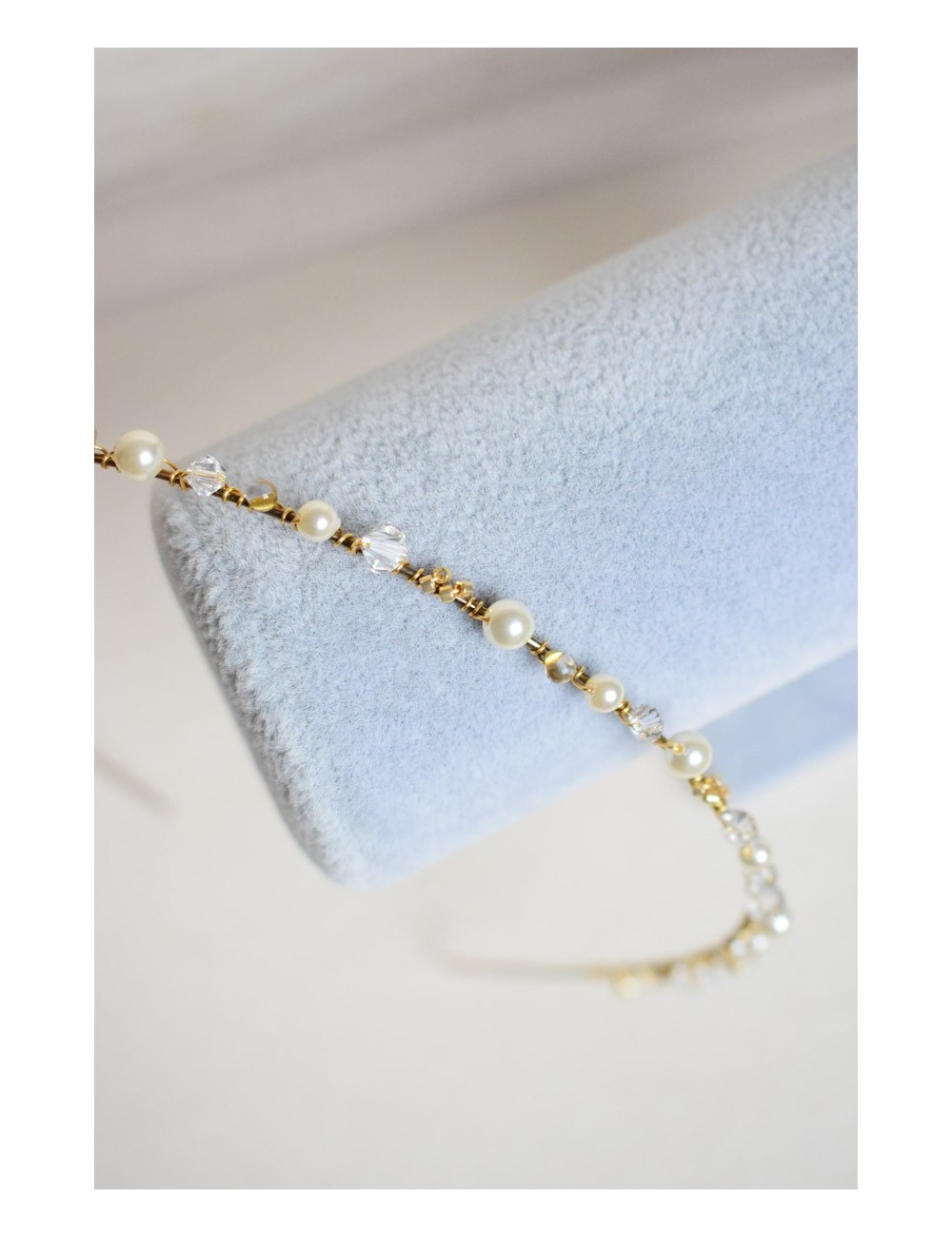 DESCRIPTION : il s'agit d'un serre-tête très fin avec des perles de verre et de cristal, ainsi que des perles nacrées. Légèrement patiné (pas doré clinquant).