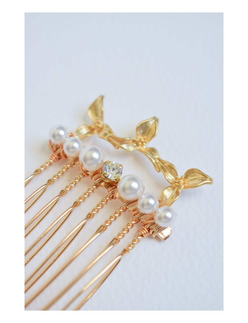 DESCRIPTION : petit peigne pour la coiffure de la mariée, avec un arc de cercles de fleurs à 3 pétales en métal posé sur une base de perles et de strass. C'est un modèle simple et discret, qui donnera une touche d'éclat au chignon ou à votre demie queue. Il est entre autres parfait si vous avez les cheveux très fins, ou une coiffure peu volumineuse. Il est idéal pour servir d'attache décorative à une demie queue également.