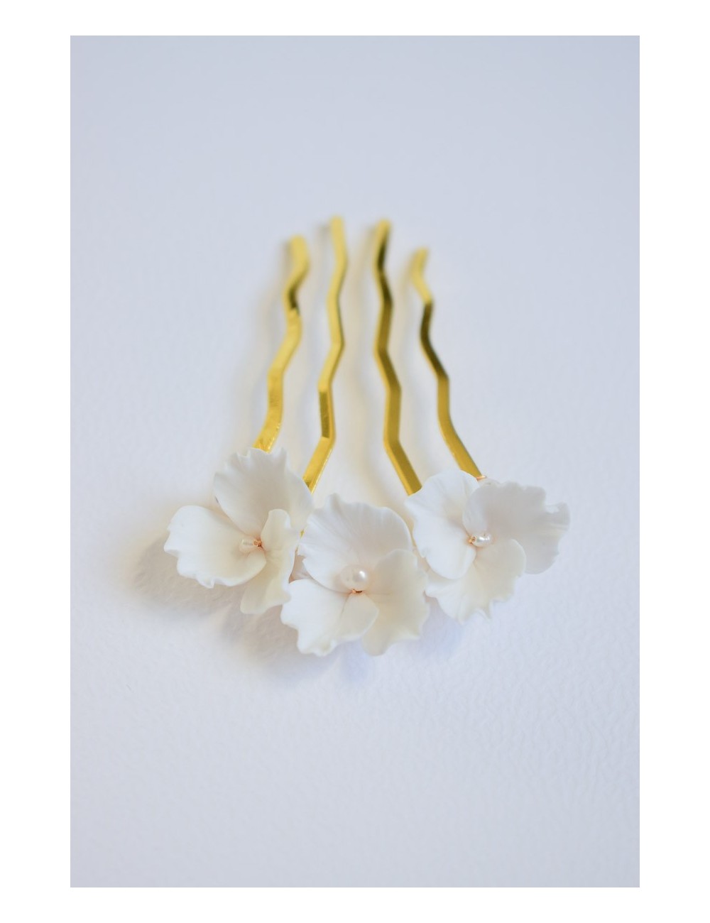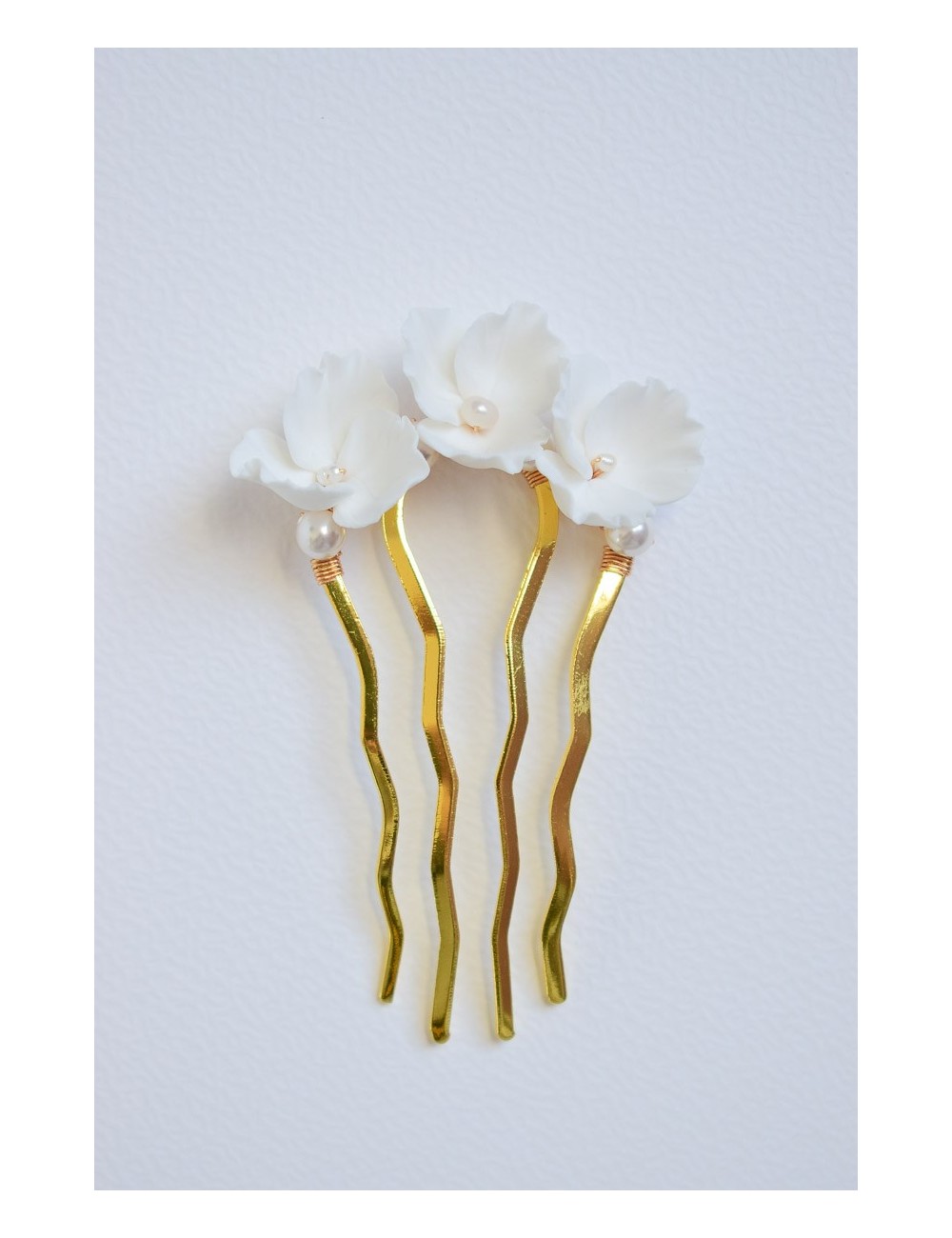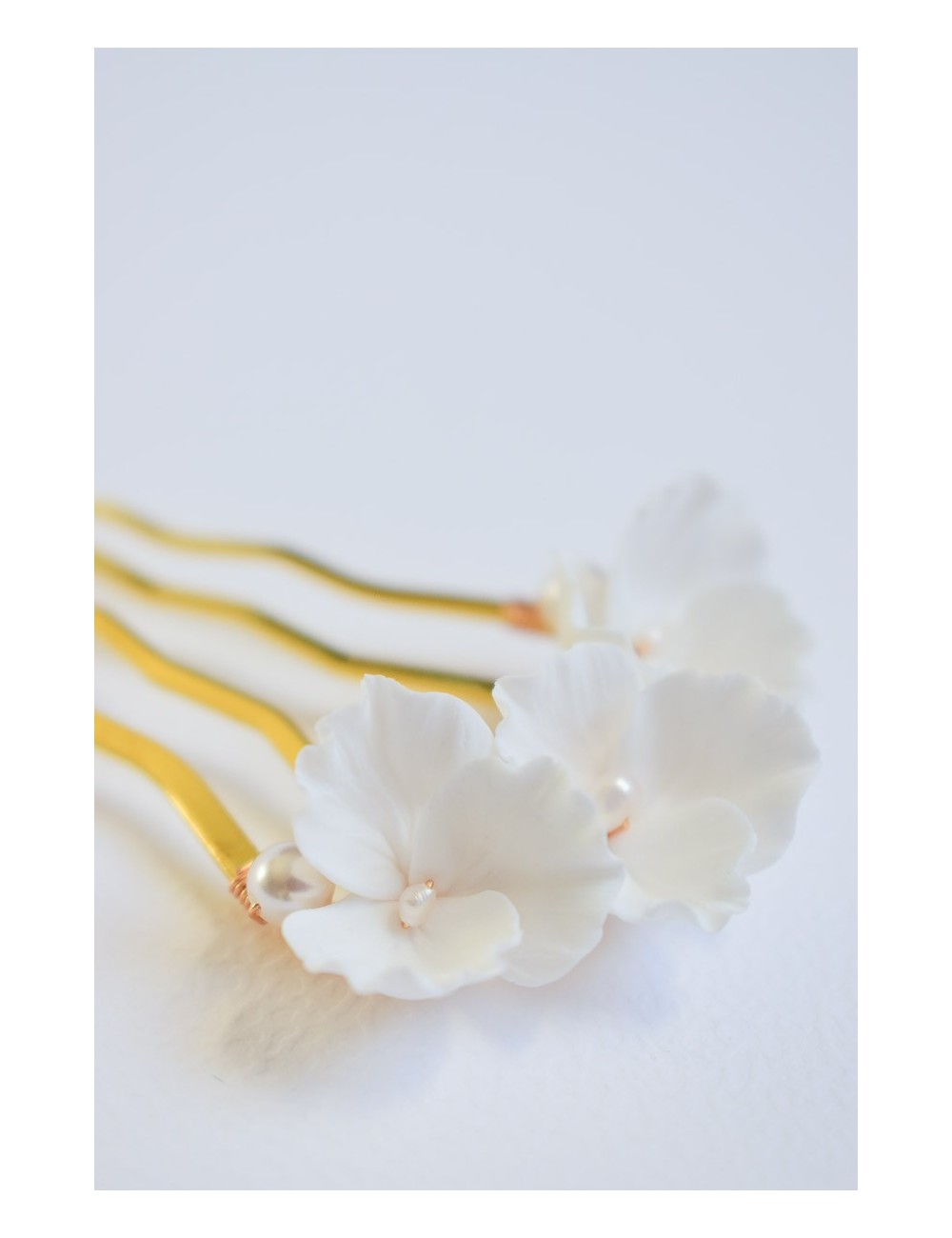 COMPOSITION : fleurs en porcelaine froide (type de pâte polymère), perles de cristal nacré et perles d'eau douce, peigne en laiton doré ou argenté.