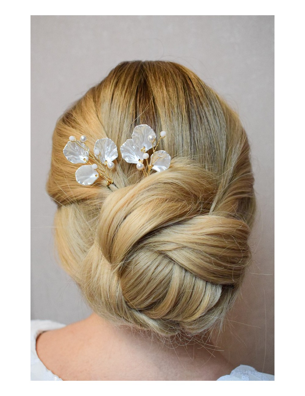 DESCRIPTION : lot de 2 pics à cheveux de mariage Valentine, composés de pétales imitation nacre et de petites étincelles de perles blanc cassé. Vendus en lot de 2. Coloris blanc cassé, finition dorée ou argentée.