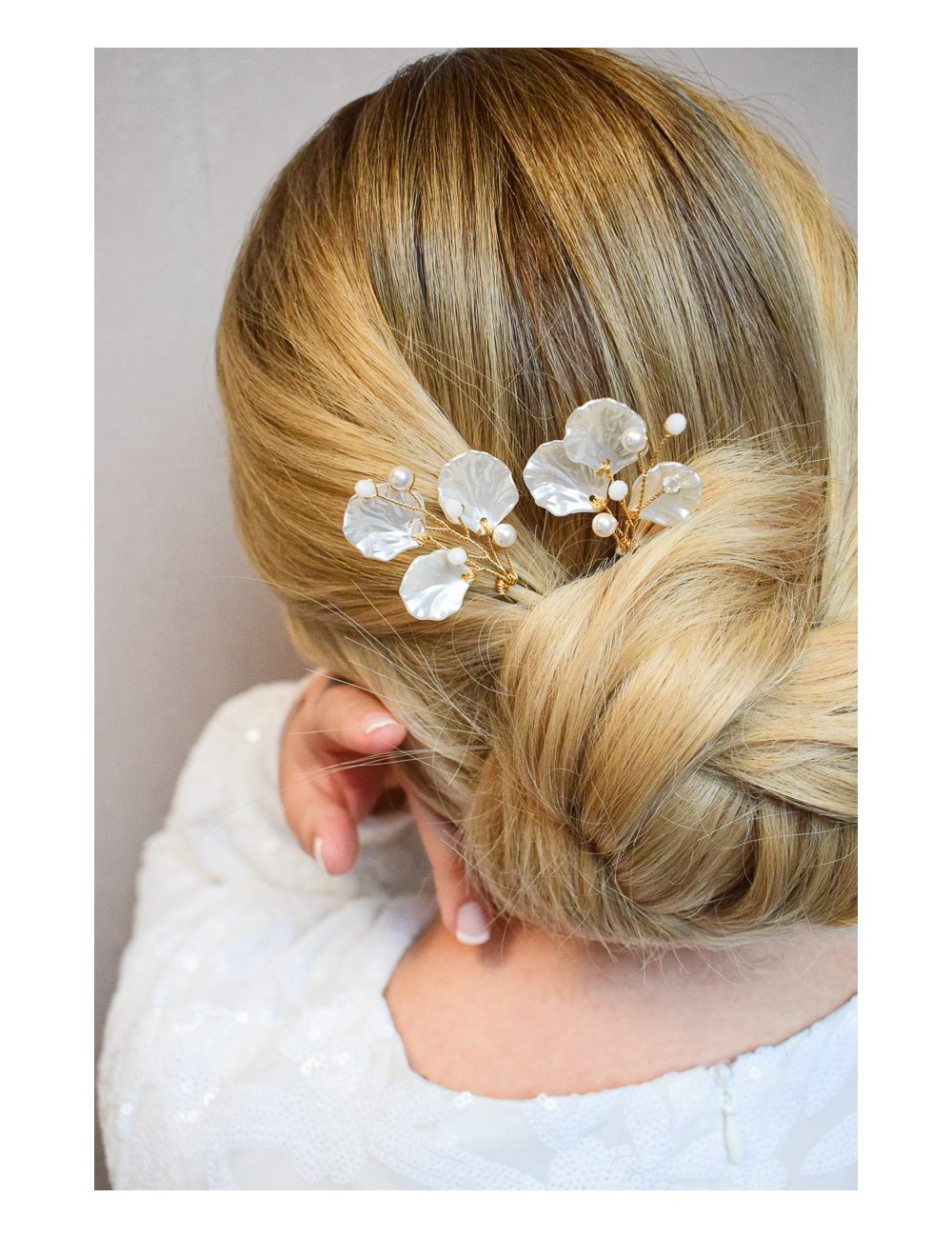 2 jolis pics avec des perles et pétales nacrés pour mariée romantique