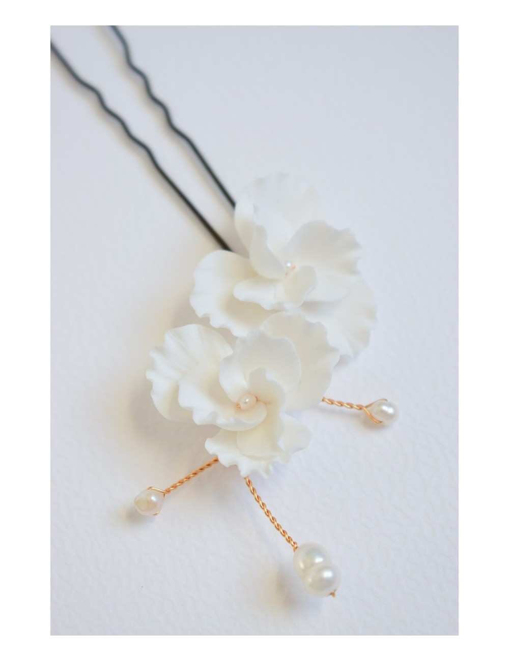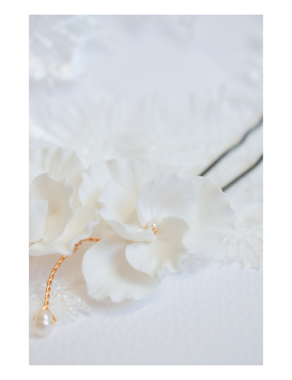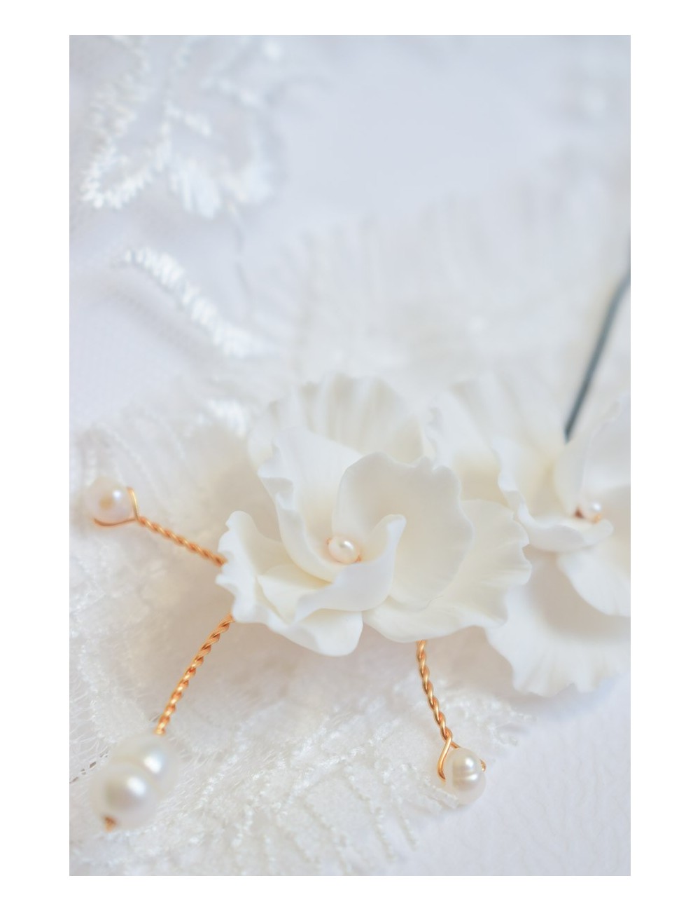 COMPOSITION : fleurs en porcelaine froide (type de pâte polymère), perles de culture d'eau douce, fil de laiton doré ou argenté.