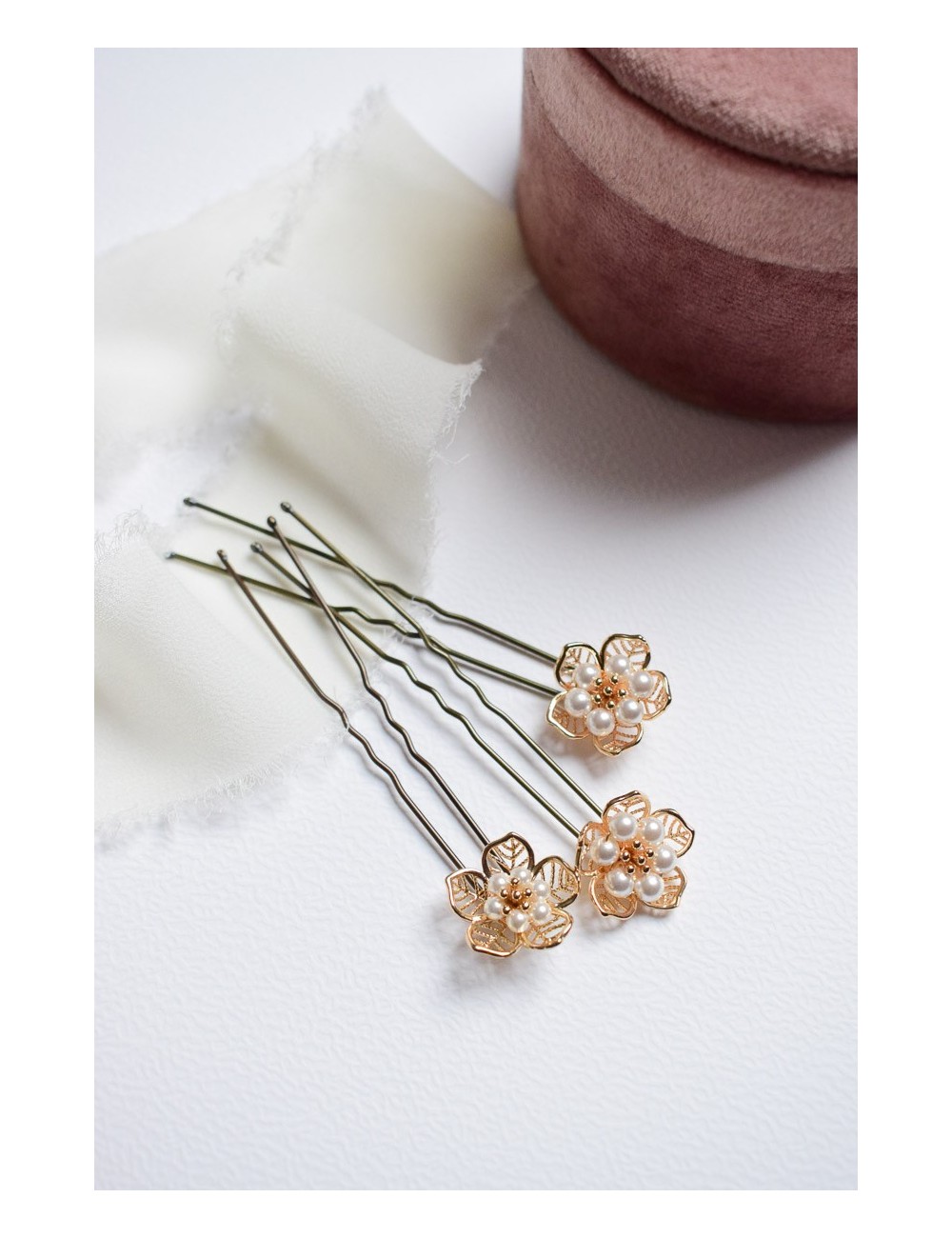 3 pics cheveux avec des fleurs dorées ajourées et des perles nacrées