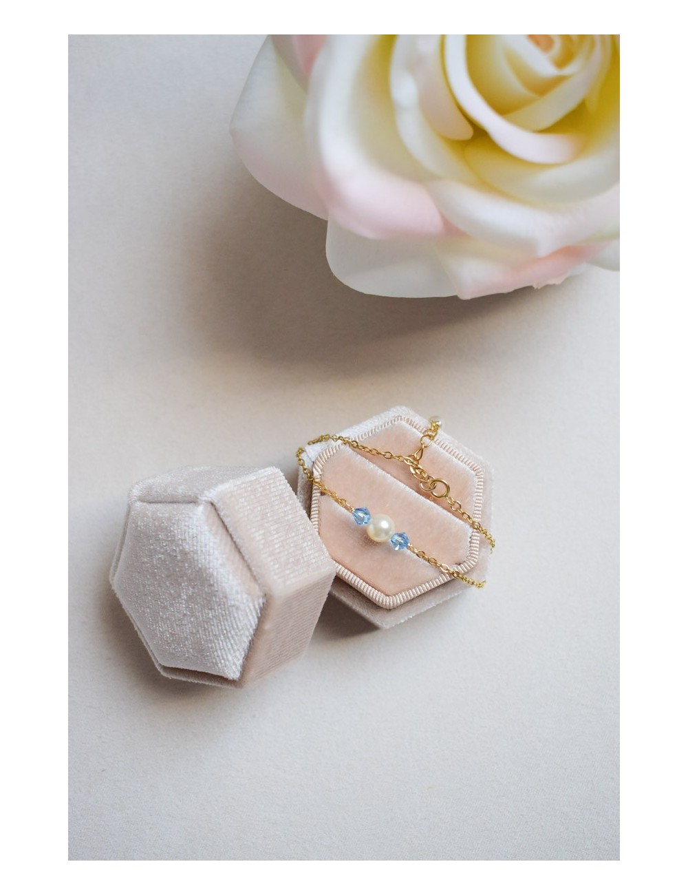 DESCRIPTION : Mon joli bracelet Orphée minimaliste dans sa version ''Something blue'', ''Quelque chose de bleu''. Il vous est proposé avec ses cristaux bleus, au lieu de transparents. Il m'est aussi possible de mettre la perle nacrée centrale en bleu, si vous le souhaitez :)