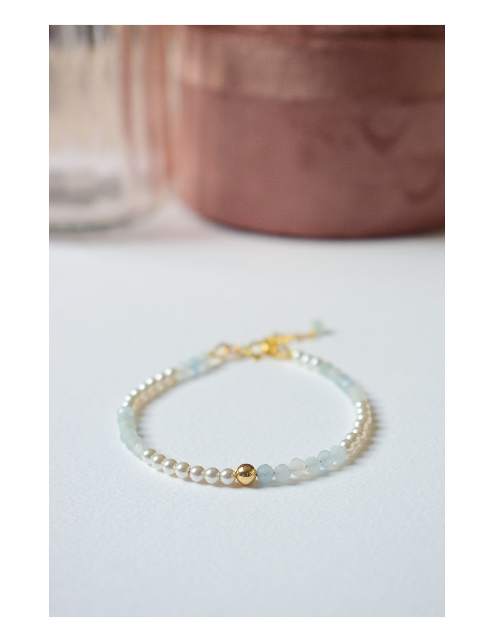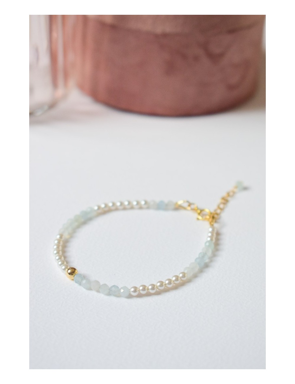 COMPOSITION : Perles de cristal nacrées et perles d'Aigue Marine véritable. Chaîne en acier inoxydable, finitions gold filled ou argent 925.
