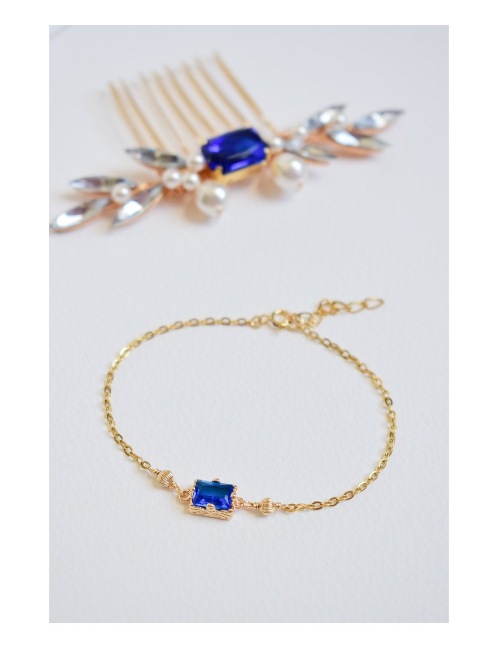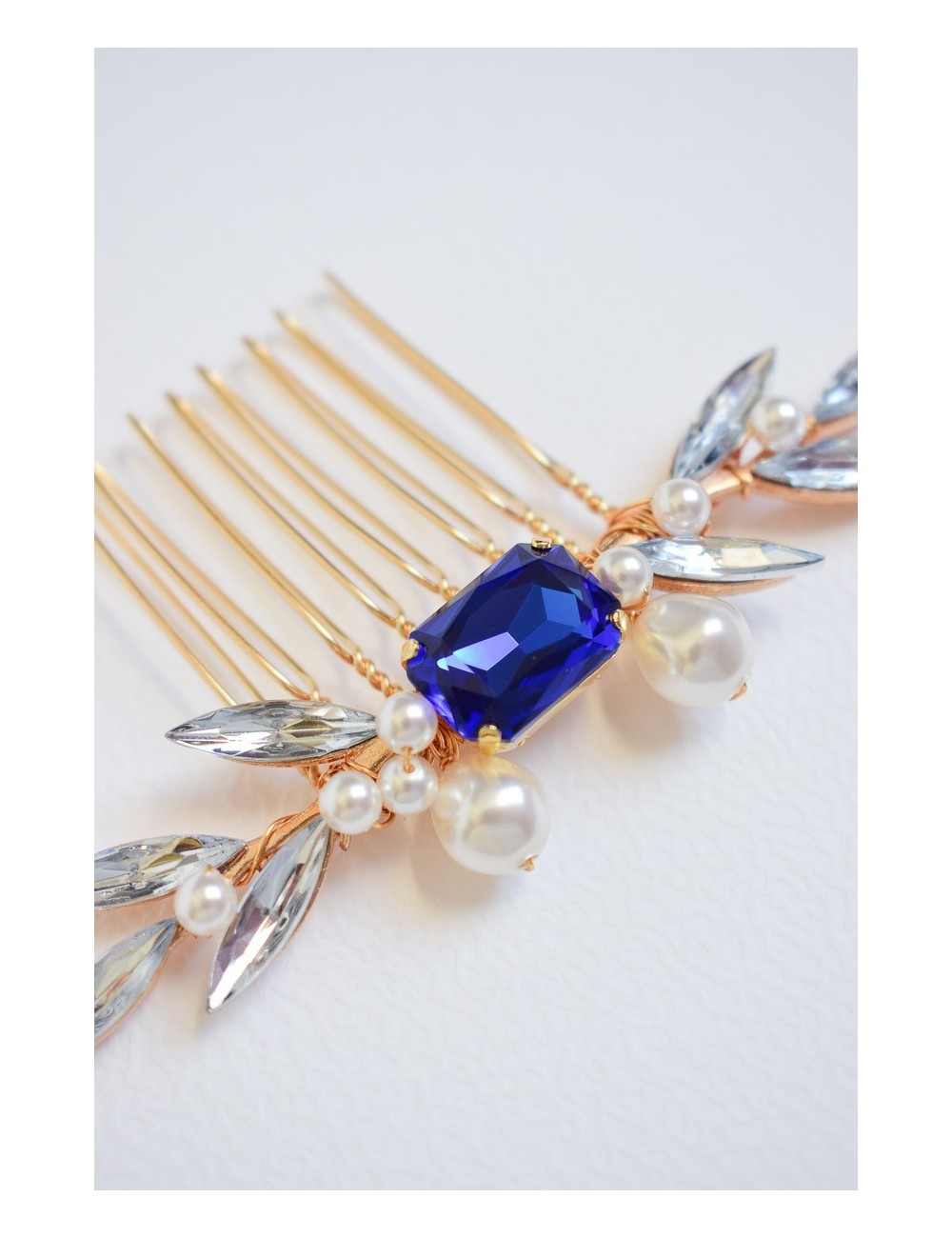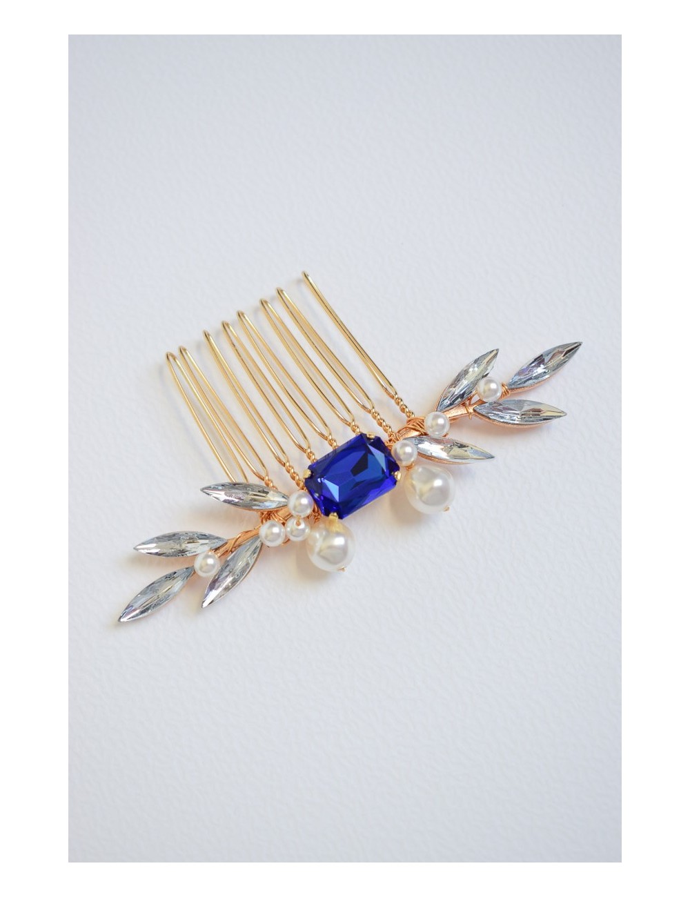 DESCRIPTION : Un peigne aux allures glamour et rétro, avec sa touche de bleu roi centrale. Il comporte deux jolies branches strassées, agrémentées de perles nacrées et d'un superbe cabochon rectangulaire de couleur bleu roi. En finition dorée, ce peigne apportera une touche de sophistication dans votre coiffure de mariée, sans oublier la traditionnelle touche de bleu pour le ''quelque chose de bleu''.